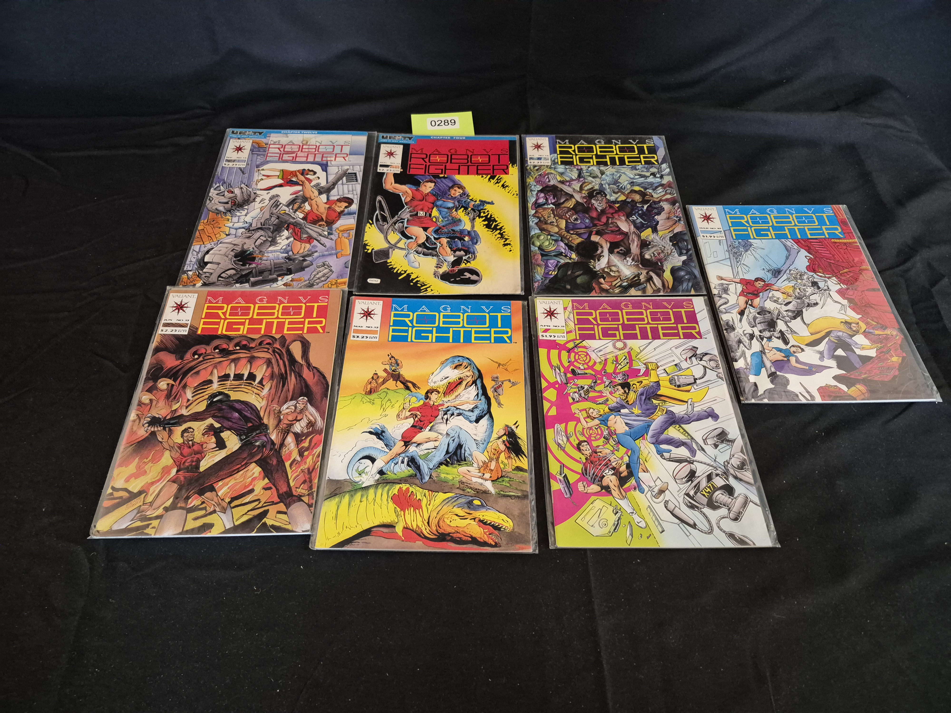 The centerpiece of the collection is Magnus Robot Fighter Vol. 2, Issue No. 12 (May 1992), which is widely recognized in the market as the first Valiant Comics appearance of Turok the Dinosaur Hunter. Other visible issues include No. 11 and No. 17. The comics feature dynamic, colorful cover artwork depicting action scenes involving futuristic heroes, robots, and dinosaurs. An inventory sticker marked "0289" is affixed to the sleeve of the second item in the top row.
