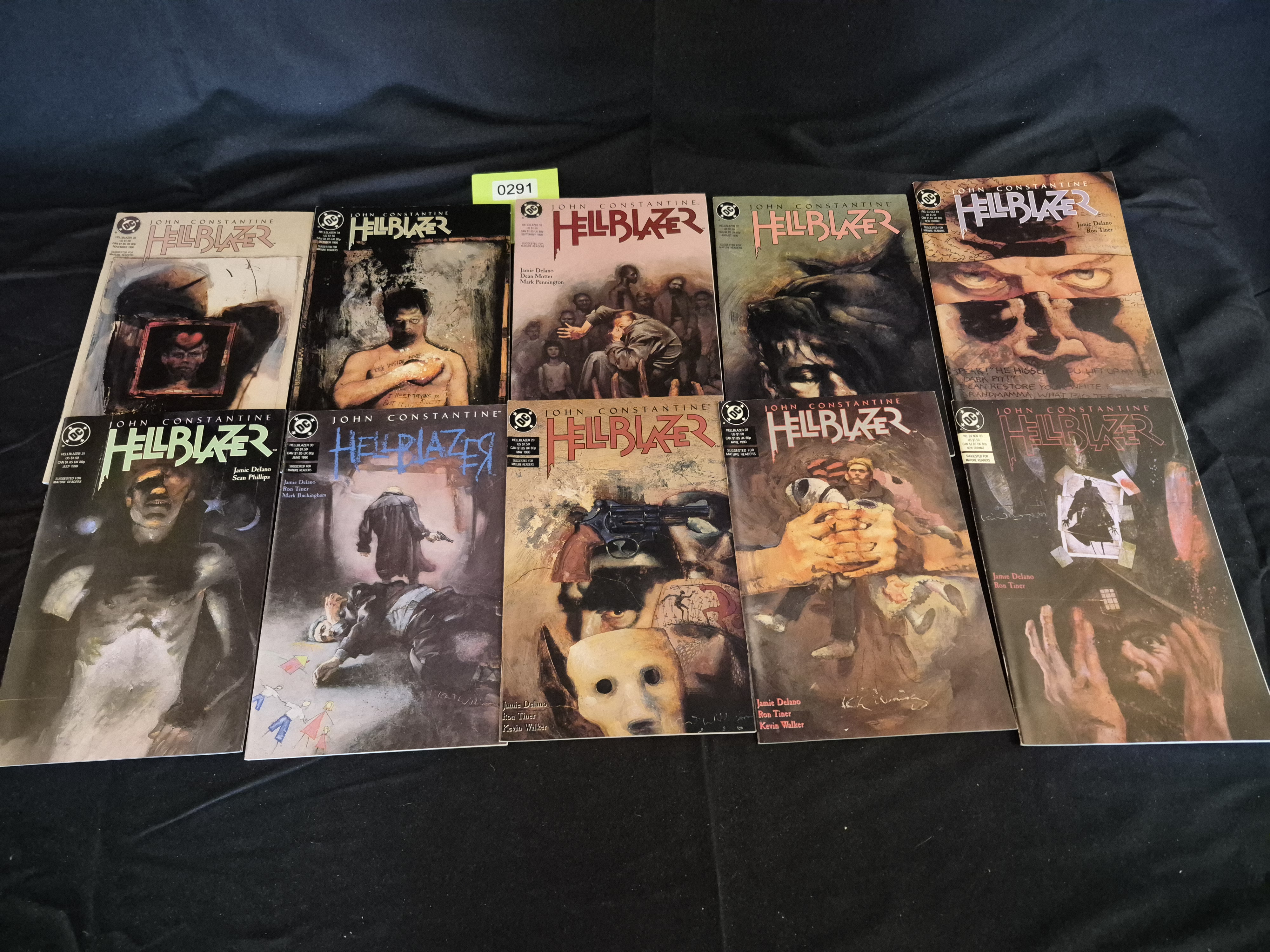 BID PER WHAT YOU SEE IN THE PHOTO, NOT THE AI GENERATED TITLES AND DESCRIPTIONS! A collection of 10 American comic books from the DC Comics/Vertigo series John Constantine Hellblazer. The lot consists of single issues published circa 1990, featuring dark, painterly cover artwork typical of the mature readers genre of the period. The issues are printed on paper and card stock and feature the DC Comics logo and notices indicating content suggested for mature readers. Visible creator credits across the lot include Jamie Delano, Sean Phillips, Ron Tiner, and Kevin Walker. Visible publication dates span 1990, including issues 29, 30, 31, 33, and 34. A yellow inventory sticker marked 0291 is affixed to the top edge of one issue in the top row.