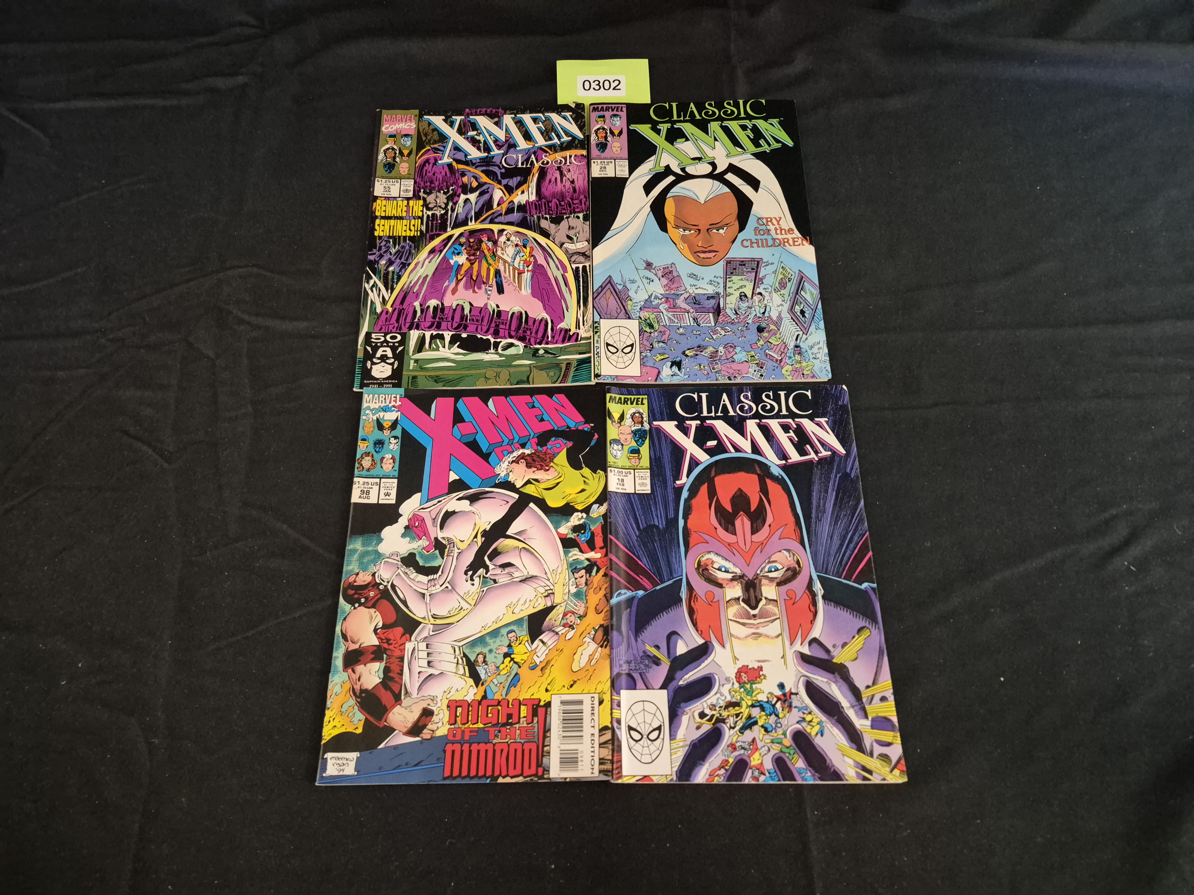 BID PER WHAT YOU SEE IN THE PHOTO, NOT THE AI GENERATED TITLES AND DESCRIPTIONS! A collection of four American comic books published by Marvel Comics, dating from the late Modern Age (c. early 1990s). The lot includes two issues of the main X-Men title and two issues of Classic X-Men. The books are printed on paper with glossy, full-color covers. Specific issues include X-Men #55 (featuring Sentinels and bearing the Captain America 50th Anniversary logo, 1941-1991) and X-Men #98 (titled ‘Night of the Nimrod!’). The lot also contains Classic X-Men #12 (titled ‘Cry for the Children’) and Classic X-Men #18 (featuring Magneto prominently on the cover). Visible markings include the Marvel Comics logo, the Spider-Man logo, and cover prices ranging from $1.00 to $1.25 US. The top right book bears a yellow inventory sticker marked ‘0302’.
