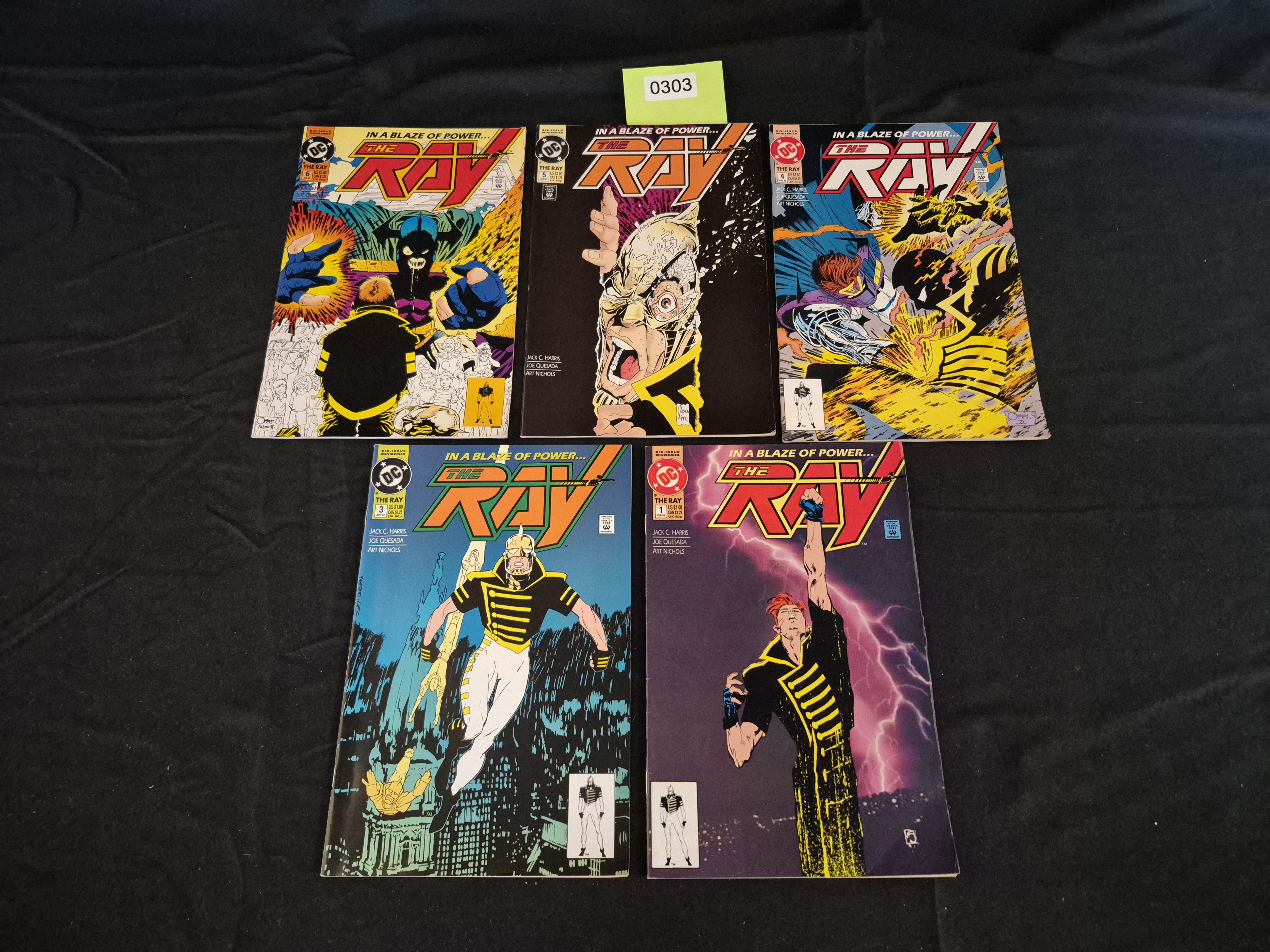BID PER WHAT YOU SEE IN THE PHOTO, NOT THE AI GENERATED TITLES AND DESCRIPTIONS! A collection of five issues from The Ray six-issue miniseries, Volume 1, published by DC Comics in 1992. The lot includes issues #1, #3, #4, #5, and #6. Each issue is a standard paper-based comic book featuring color pictorial covers displaying the title THE RAY and the subtitle IN A BLAZE OF POWER… The creative team listed on the covers includes Jack C. Harris, Joe Quesada, and Art Nichols. The visible cover price marking is $1.00 US / $1.25 CAN. The issues are identified by the yellow-green tag marked 0303.