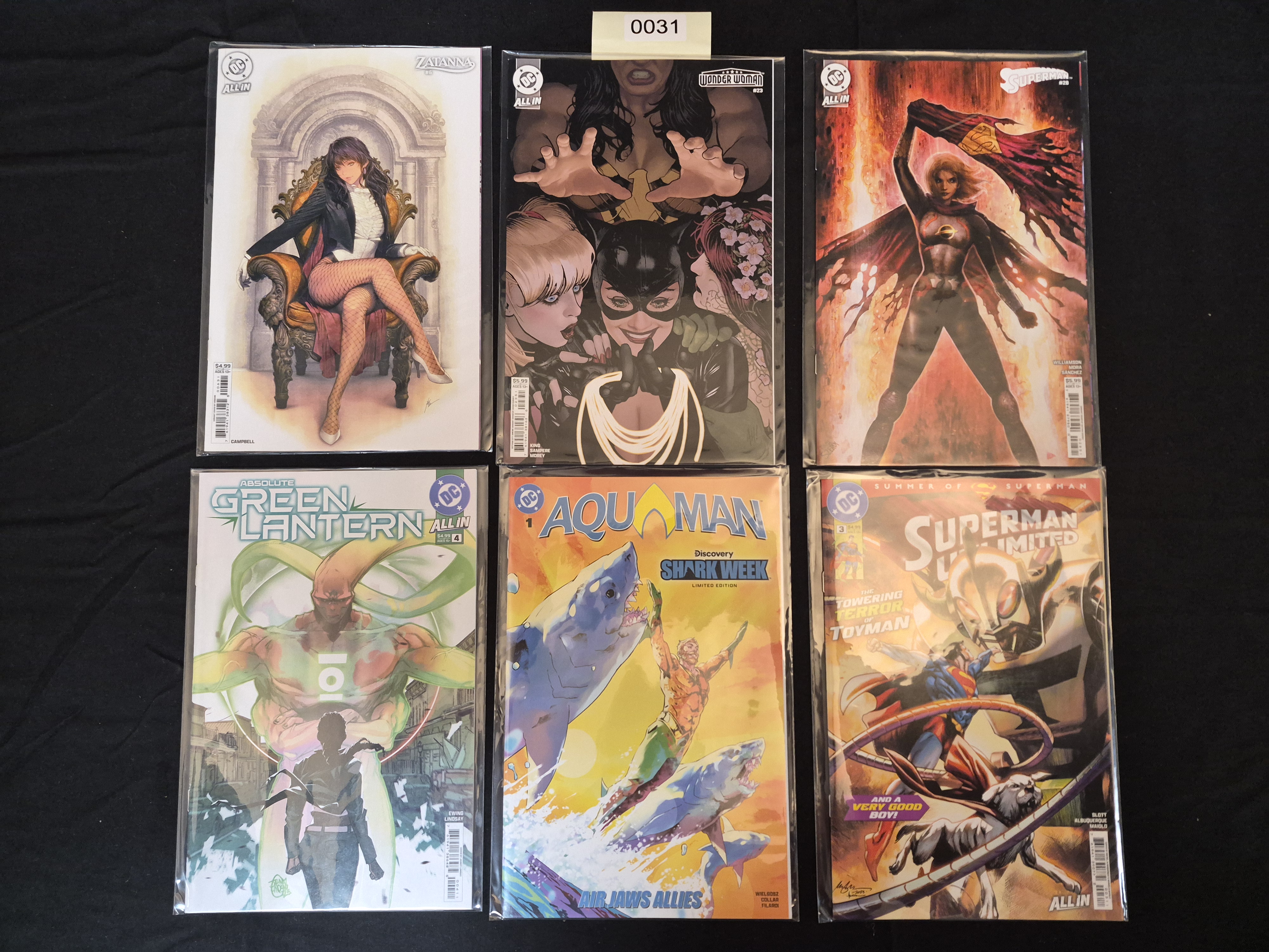 BID PER WHAT YOU SEE IN THE PHOTO, NOT THE AI GENERATED TITLES AND DESCRIPTIONS! A collection of six contemporary DC Comics comic books, published in the modern era and featuring the DC “ALL IN” branding. The lot includes various titles and issue numbers, all individually protected in clear plastic sleeves. Specific titles visible in the collection are Zatanna #6, Wonder Woman #23, Superman #20, Absolute Green Lantern #4, Aquaman #1 (marketed as a Discovery Shark Week Limited Edition), and Superman Unlimited #3. The covers feature bright, full-color art typical of the superhero genre, with visible cover prices ranging from $4.99 to $5.99.