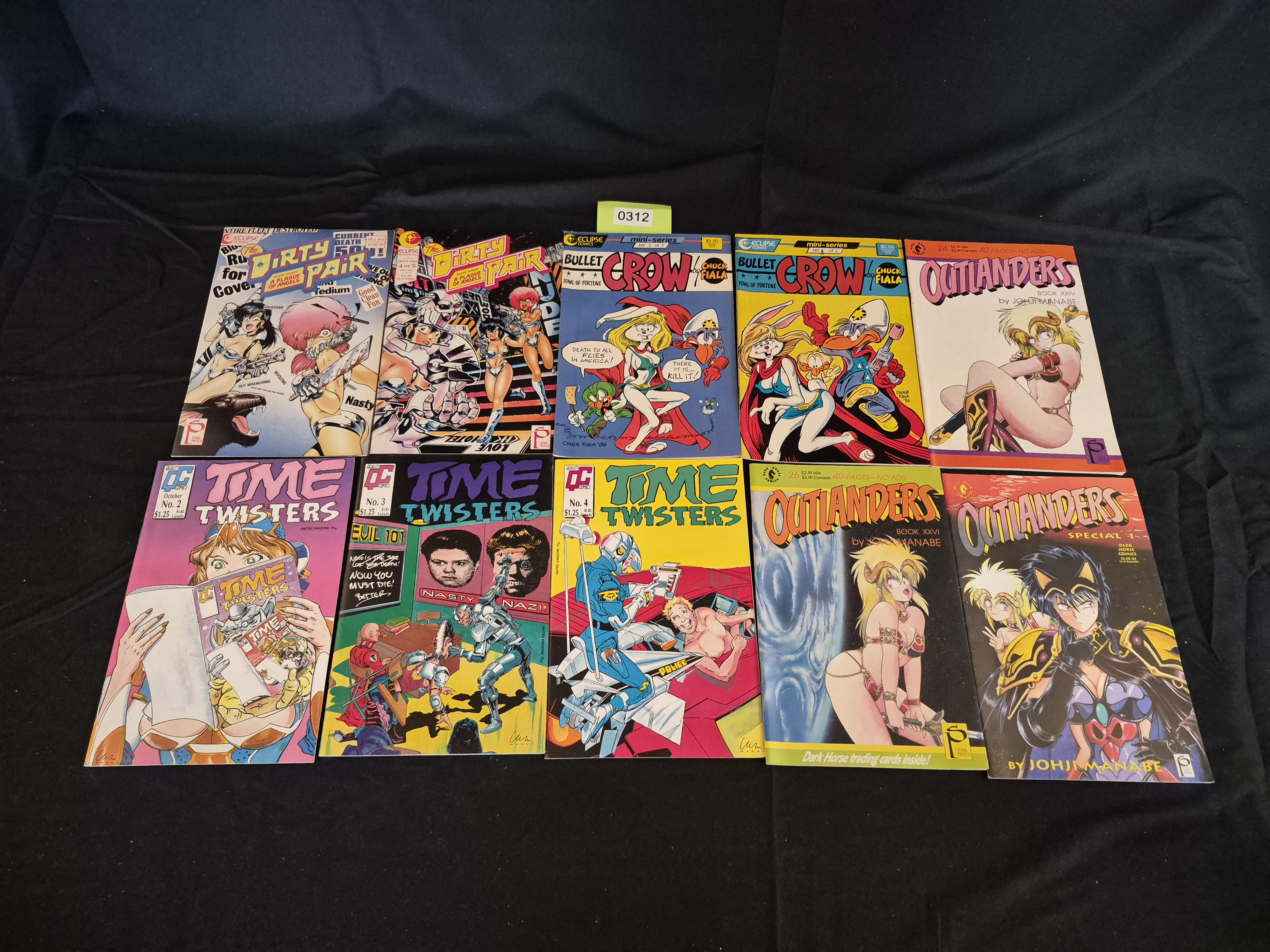 The collection includes three issues of Time Twisters (Quality Comics, Nos. 2, 3, and 4), multiple issues of The Dirty Pair (Eclipse Comics), including Book Three: A Plague of Angels, two issues of the Bullet Crow mini-series (Eclipse Comics), and three issues of Outlanders (Dark Horse Comics), including Book XXIV, Book XXVI, and Special 1. One issue of Outlanders features visible text stating Dark Horse trading cards inside. The covers display US and Canadian pricing.
