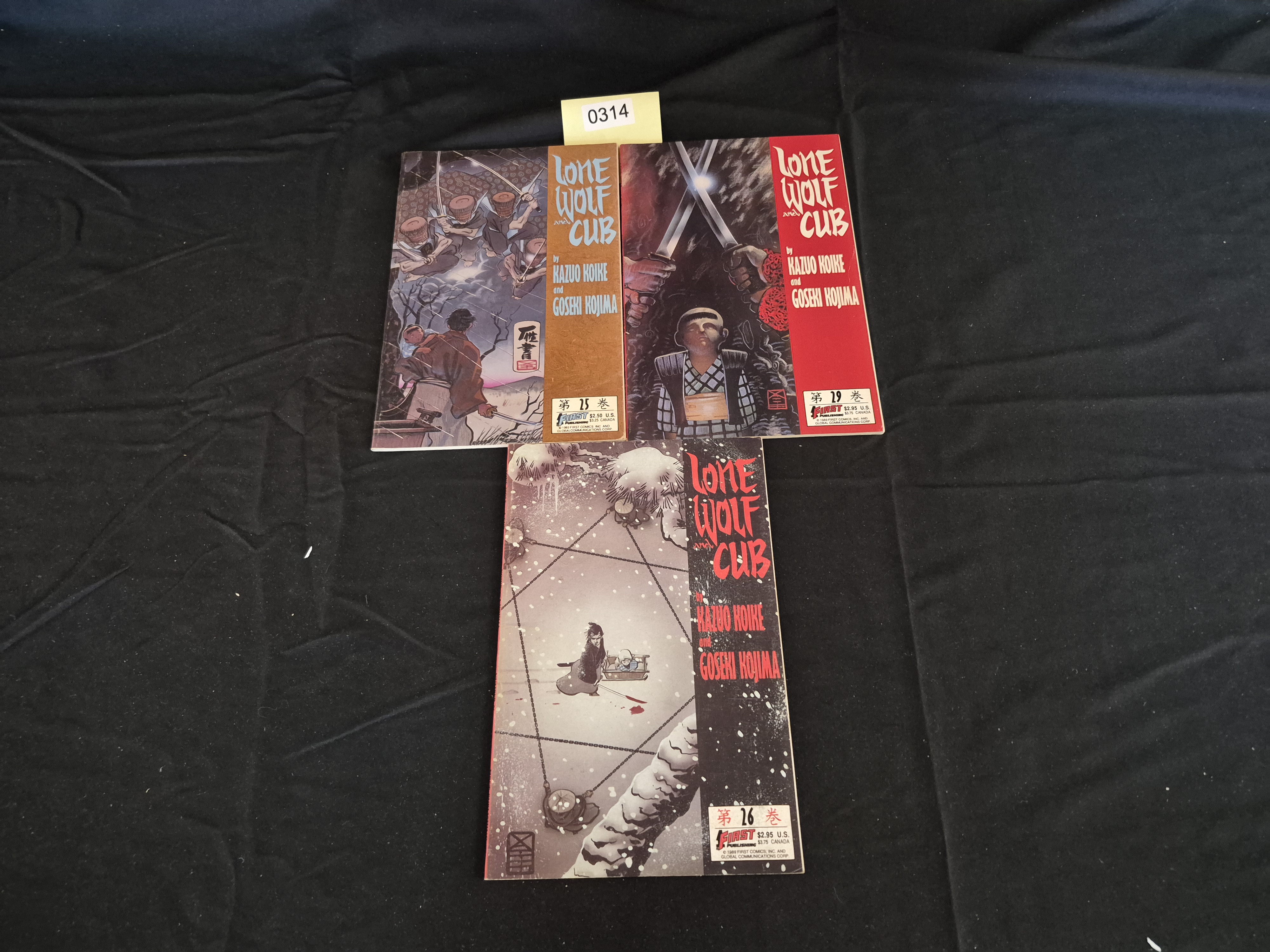 BID PER WHAT YOU SEE IN THE PHOTO, NOT THE AI GENERATED TITLES AND DESCRIPTIONS! A collection of three individual paperback comic books, or graphic novels, comprising volumes from the American translation of the classic Japanese manga series Lone Wolf and Cub. The series is written by Kazuo Koike and illustrated by Goseki Kojima. The volumes were published by First Comics, Inc. and First Publishing. The lot includes Volume 25, Volume 26, and Volume 29. Each volume features full-color, dramatic cover art depicting samurai figures and scenes, consistent with the series’ aesthetic. Visible copyright information on the covers confirms the publication date of 1989. The spine and cover of each volume display the volume number in both English and Japanese text (e.g., “第 25 卷”). Visible original U.S. cover prices are $2.50 for Volume 25 and $2.95 for Volumes 26 and 29.