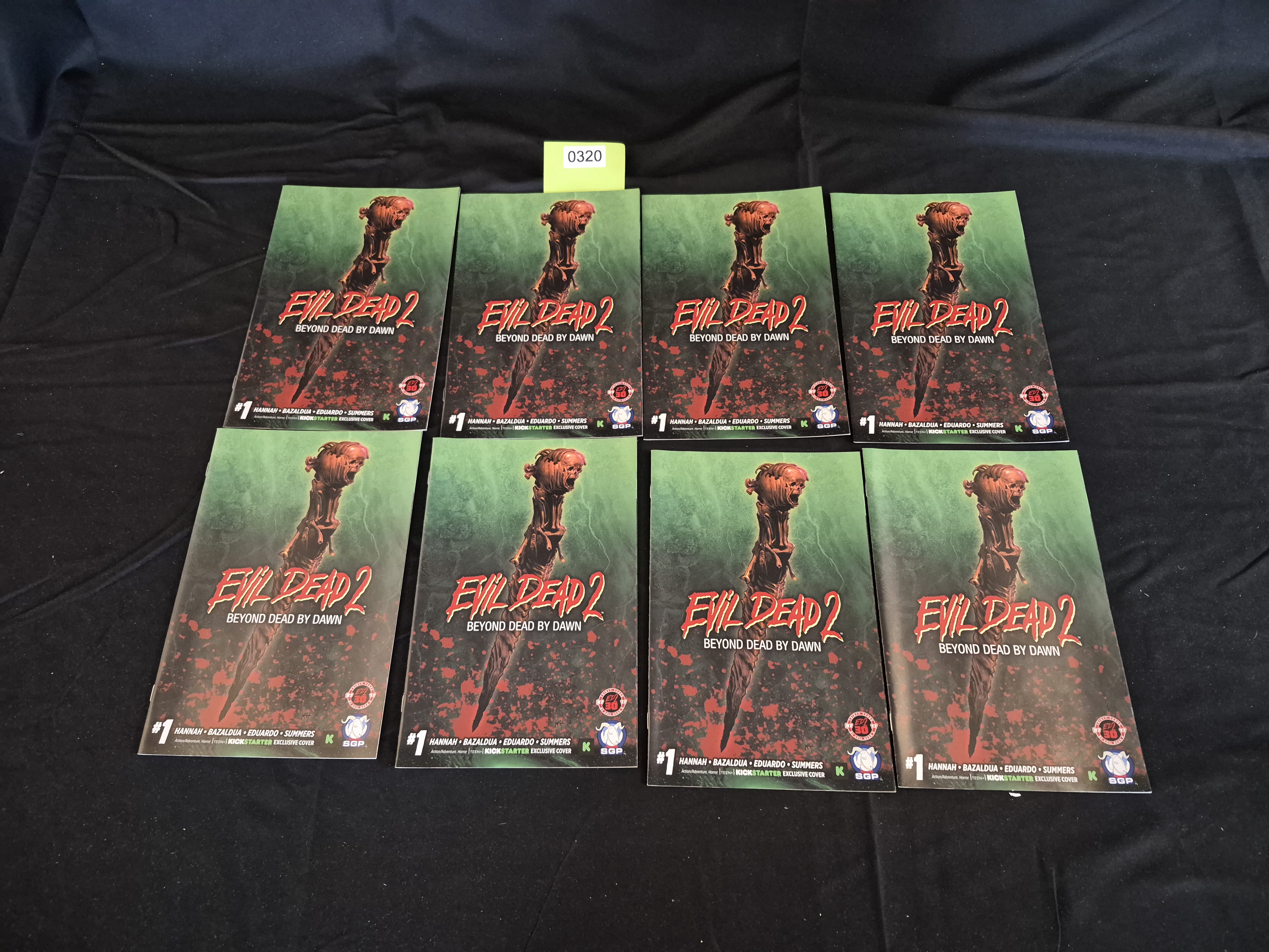BID PER WHAT YOU SEE IN THE PHOTO, NOT THE AI GENERATED TITLES AND DESCRIPTIONS! A collection of eight identical modern comic books, titled Evil Dead 2: Beyond Dead By Dawn, issue #1, published by Space Goat Publishing (SGP). These are identified through market consensus as the Kickstarter Exclusive Cover variant, likely produced around the 30th Anniversary (1987-2017). The comics are softcover, printed on glossy paper, and feature horror-style artwork depicting a detailed, stylized skeletal/demonic staff or idol set against a mottled green and black background splattered with red blood. The cover displays creator credits including Hannah, Bazaldua, Eduardo, and Summers, along with an Evil Dead 30th Anniversary 1987-2017 circular logo and the SGP publisher logo. The items are offered as a single lot.