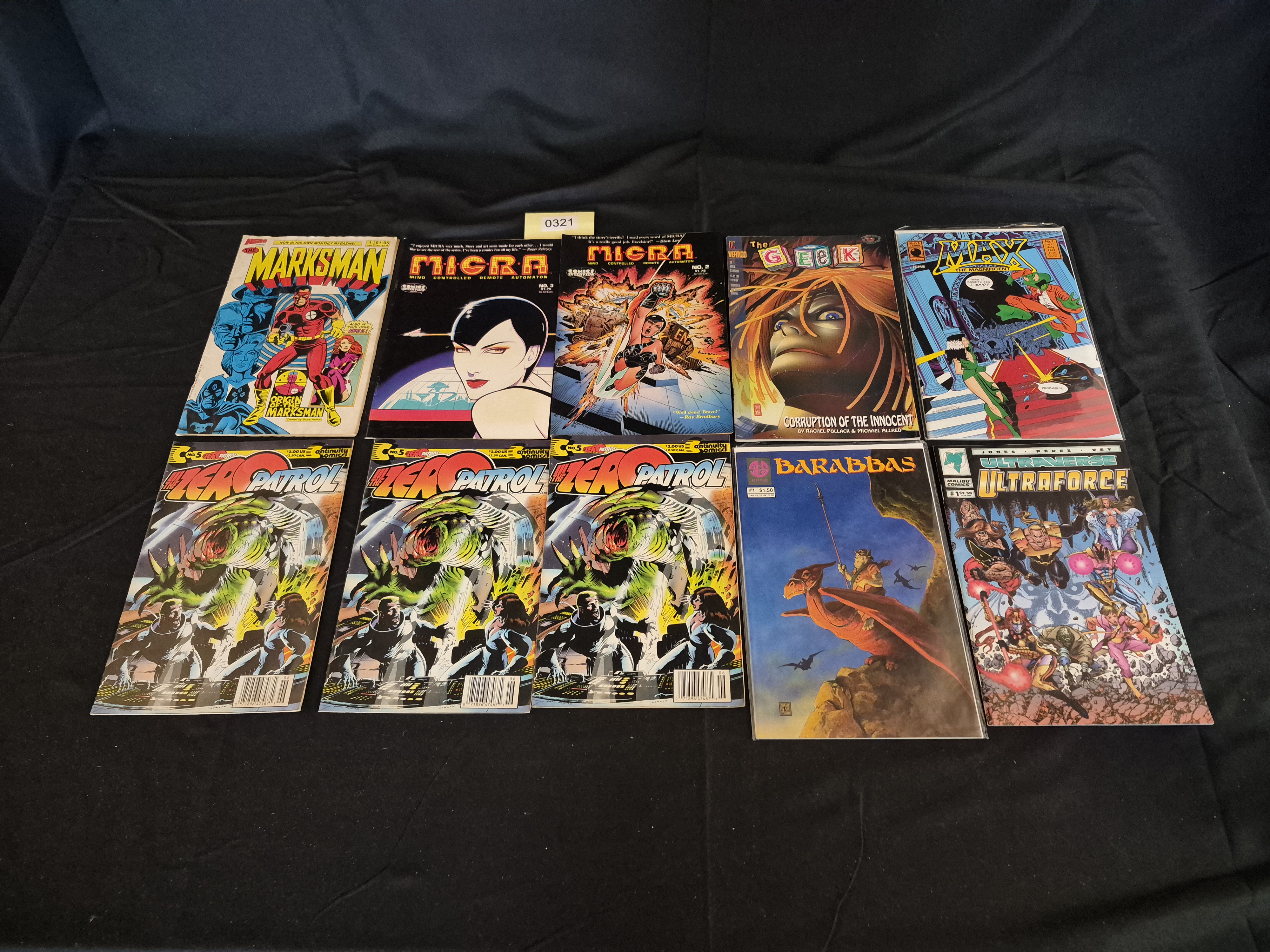BID PER WHAT YOU SEE IN THE PHOTO, NOT THE AI GENERATED TITLES AND DESCRIPTIONS! A collection of 10 standard-size, full-color comic books and magazine-format periodicals, predominantly featuring independent and alternative publishers from the 1980s and 1990s. The lot includes a variety of genres, including superhero, science fiction, and fantasy. Specific titles present are: The Marksman (1 issue), Micra (2 issues, No. 2 and No. 3), The Geek (DC Vertigo, “Corruption of the Innocent”), Jax the Magnificent (1 issue), The Zero Patrol No. 5 (Antinuity Comics, 3 copies), Barabbas No. 1 (Slave Labor Graphics, 1986), and Ultraverse Ultraforce (Malibu Comics, 1 issue). The Barabbas title is associated with creator Dan Vado and Slave Labor Graphics, as confirmed by market research. An inventory sticker marked 0321 is visible centered above the top row.