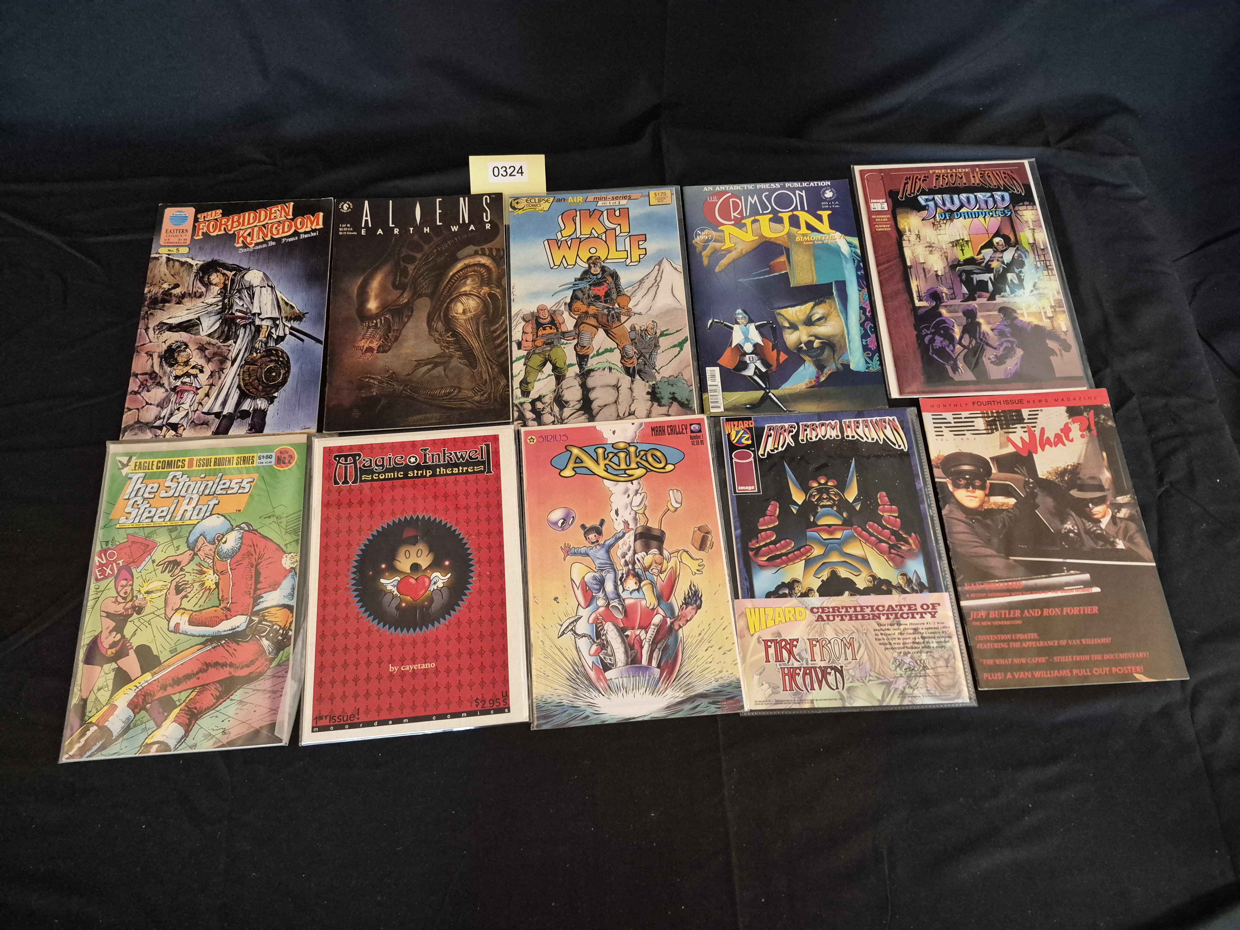 BID PER WHAT YOU SEE IN THE PHOTO, NOT THE AI GENERATED TITLES AND DESCRIPTIONS! A collection of 10 individual comic books and specialized fan magazines from the Modern Age of comics, published by various independent companies. The lot includes titles such as Akiko #1 (Sirius Comics, 1996), which aligns with market consensus keywords regarding the Akiko and Sirius titles. Other titles present include Aliens Earth War (Dark Horse), The Forbidden Kingdom No. 5 (Eastern Comics), Sky Wolf (Eclipse Comics), The Crimson Nun (Antarctic Press, Nov 1997), and The Stainless Steel Rat No. 2 (Eagle Comics). Also included is a copy of Fire From Heaven (Image Comics) in the Wizard 1/2 edition, which retains a visible Certificate of Authenticity insert. The collection is rounded out by Magic Inkwell (1st issue) and What?! Magazine (Vol 4 No 4), which features The Green Hornet (Van Williams). All items are housed in protective plastic sleeves.