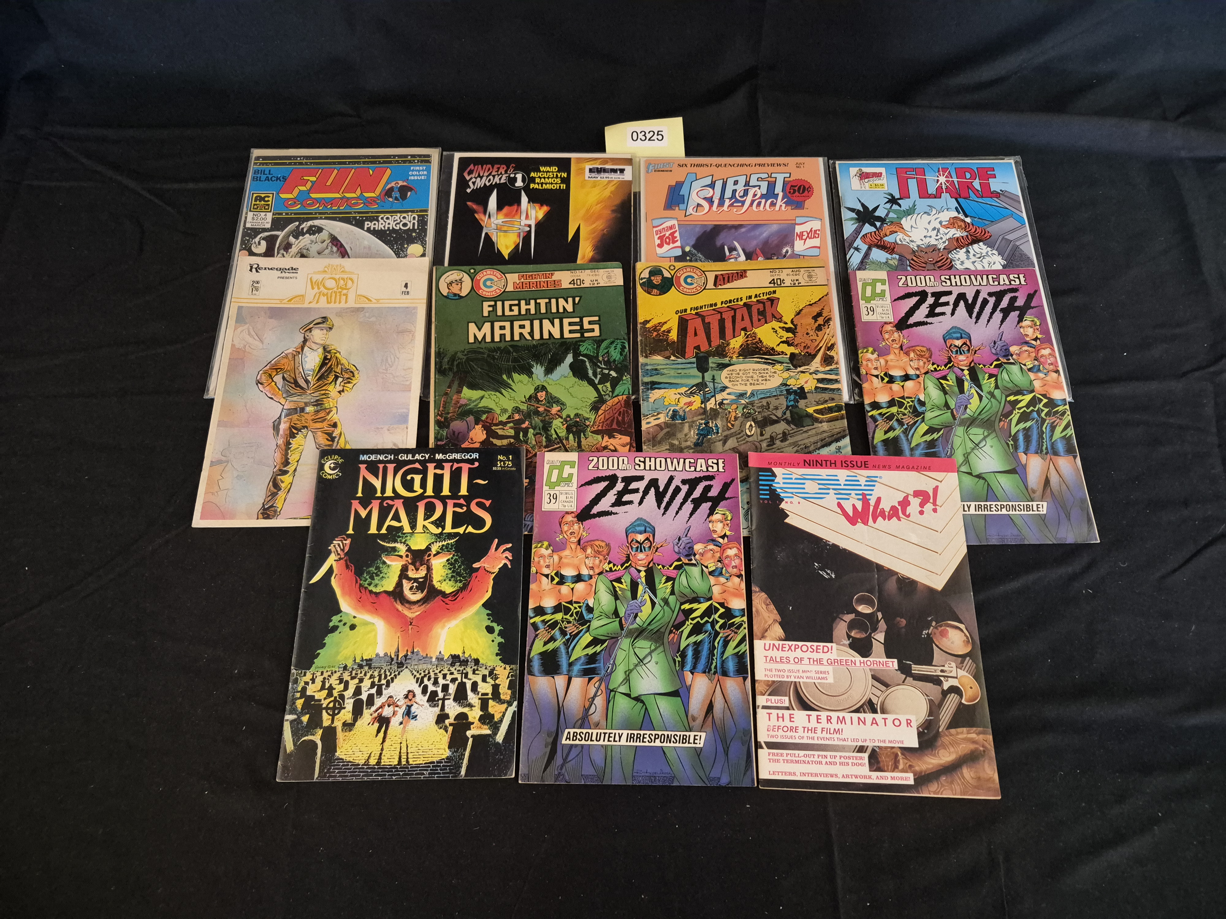 BID PER WHAT YOU SEE IN THE PHOTO, NOT THE AI GENERATED TITLES AND DESCRIPTIONS! The collection consists of 11 periodical publications, primarily mixed-genre comic books and magazines spanning the Bronze Age through the Modern Age (circa 1970s-1990s). The lot features several key publishers including Quality Comics (QC), Charlton Comics, AC Comics, Eclipse Comics, First Comics, and Renegade Press. Titles identified include multiple issues of 2000 AD Showcase featuring Zenith, confirming the strong market consensus for these Quality Comics titles, which are often associated with Fleetway/2000 A.D. Specific issues include Fightin’ Marines No. 147 (Charlton), Our Fighting Attack No. 23 (Charlton), Fun Comics No. 4 (AC Comics), Night-Mares No. 1 (Eclipse Comics), Cinder & Smoke Ash No. 1, First Six-Pack No. 1, and the news magazine What?! Vol 1. No. 9, which advertises features on The Terminator and The Green Hornet. The publications are constructed of printed paper with cardstock covers.