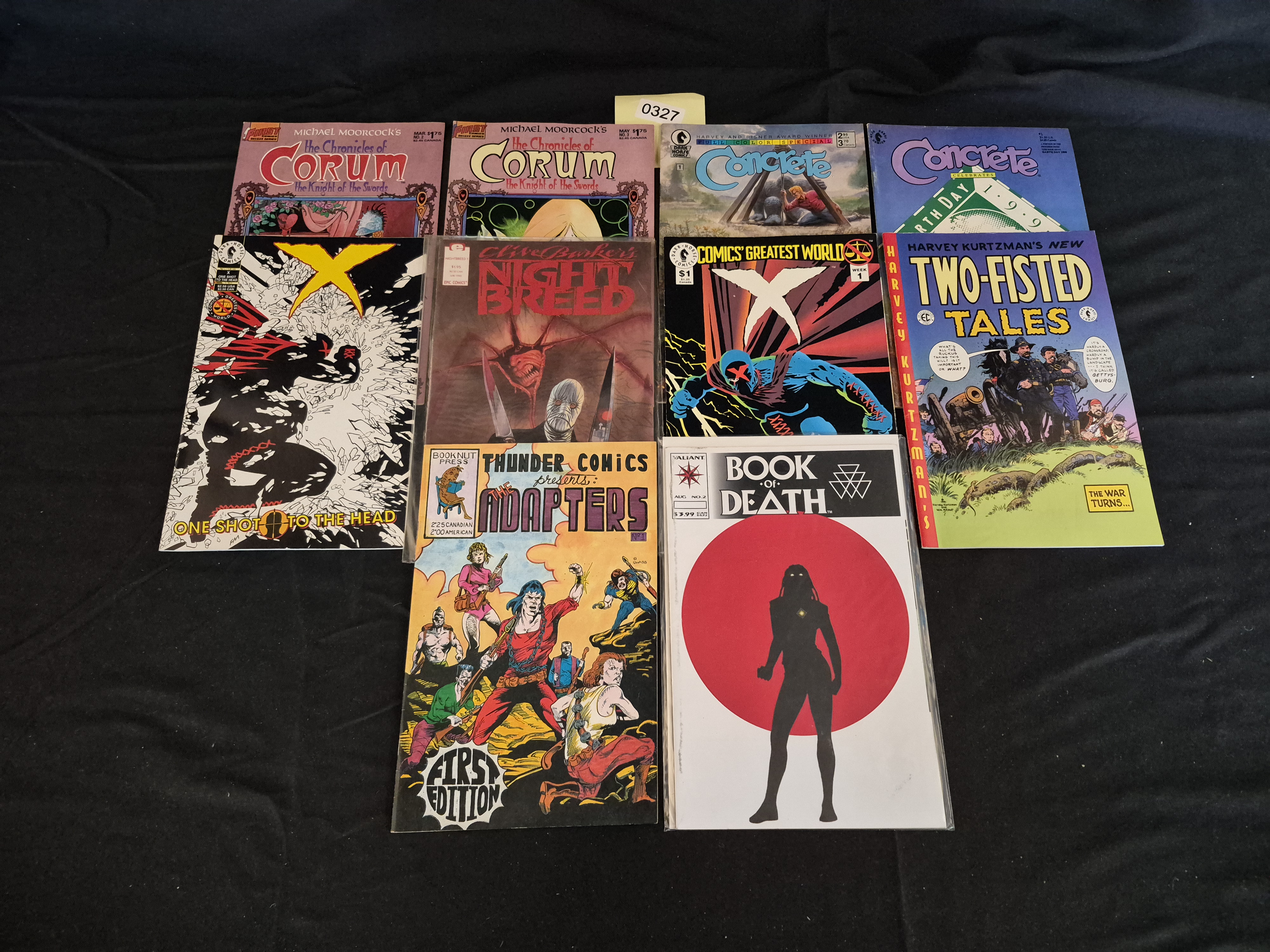 BID PER WHAT YOU SEE IN THE PHOTO, NOT THE AI GENERATED TITLES AND DESCRIPTIONS! A collection of ten Modern Age comic books published primarily by independent and specialty publishers. The grouping includes various titles such as Michael Moorcock’s The Chronicles of Corum (First Comics), Concrete (Dark Horse Comics, including an Earth Day 1990 issue), Clive Barker’s Night Breed (Epic Comics), X: One Shot To The Head (Dark Horse Comics), X: Week 1 (Dark Horse Comics), Harvey Kurtzman’s New Two-Fisted Tales (Dark Horse Comics), Thunder Comics Presents: The Adapters (Booknut Press/First Edition), and Book of Death #2 (Valiant). The comics are constructed of paper and ink.