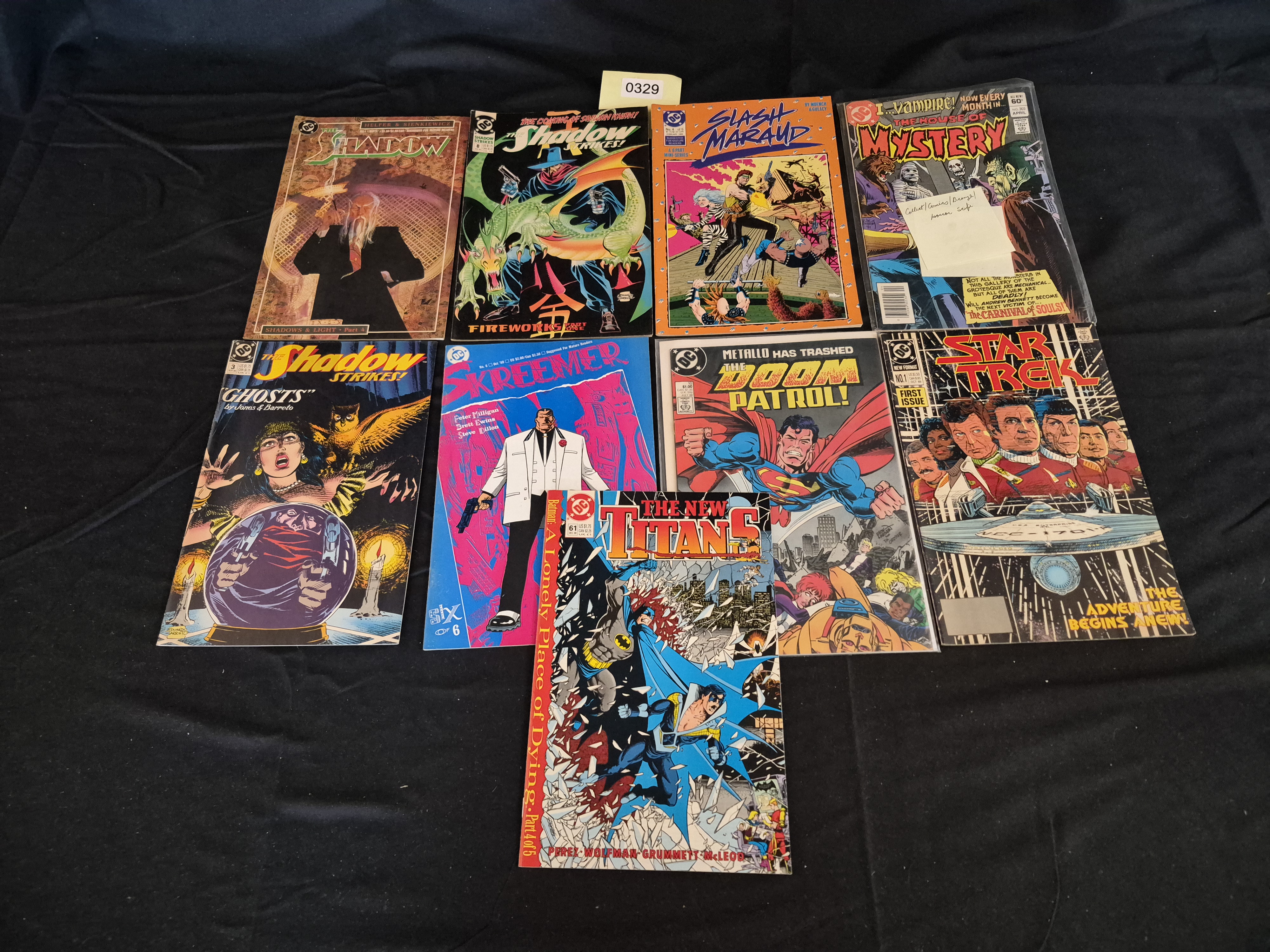 BID PER WHAT YOU SEE IN THE PHOTO, NOT THE AI GENERATED TITLES AND DESCRIPTIONS! A collection of 9 American comic books, primarily published by DC Comics, dating generally from the Copper to Modern Age (late 1980s to early 1990s). The collection is anchored by The New Titans #61 (December 1989), which is widely identified in the market and features a Batman crossover. The lot includes various titles such as multiple issues of The Shadow and The Shadow Strikes!, Slash Maraud No. 4 (of 6), Skreemer No. 6, The Doom Patrol! (featuring Superman), and I… Vampire: House of Mystery No. 302. One issue of Star Trek is also present. The comics are constructed of printed paper. One issue, I… Vampire: House of Mystery No. 302, is stored in a protective plastic sleeve, which has an affixed piece of paper with handwritten notes including “bronze” and “scifi.” A small yellow lot tag labeled “0329” is present near the top center of the collection.