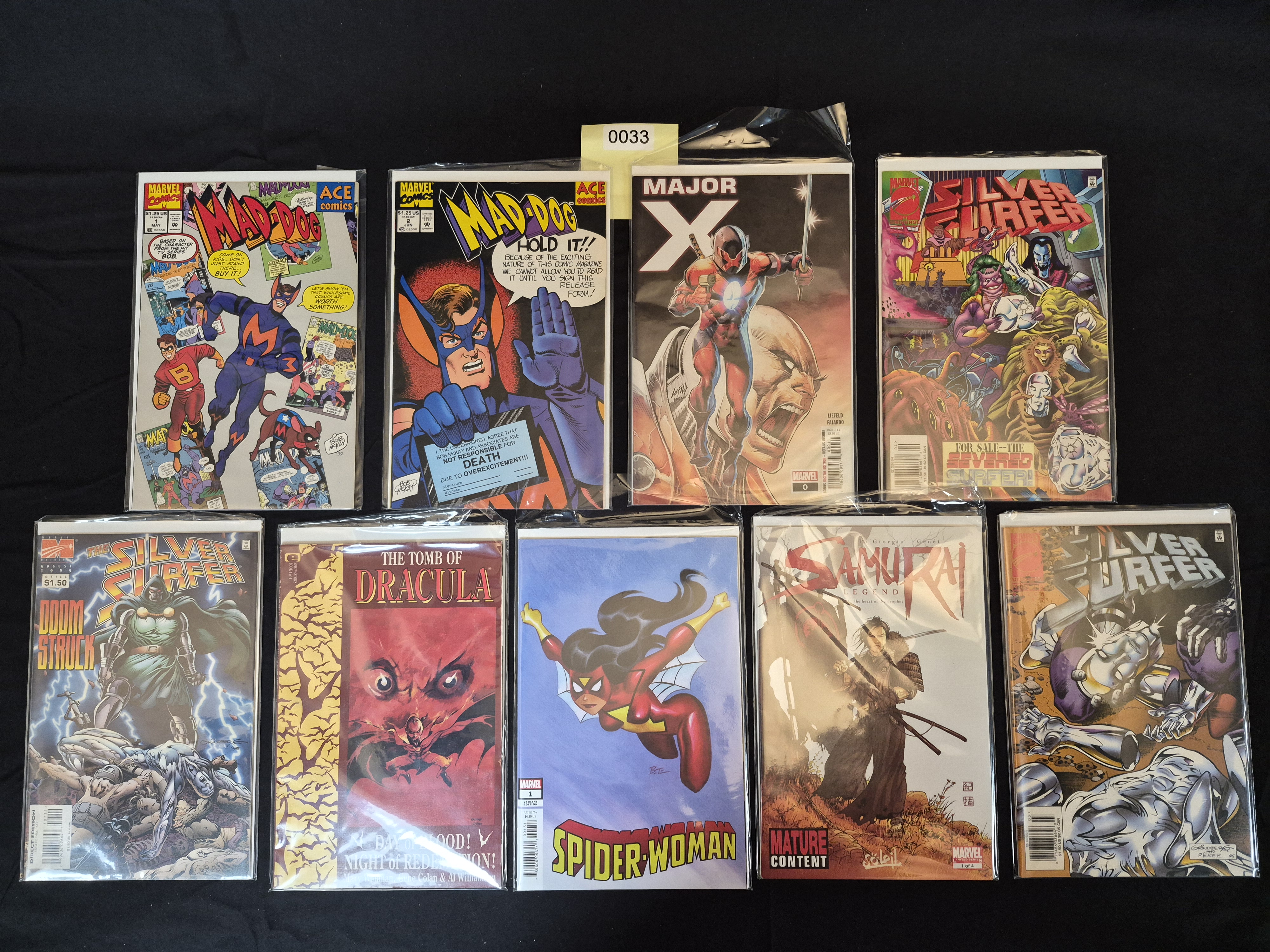 BID PER WHAT YOU SEE IN THE PHOTO, NOT THE AI GENERATED TITLES AND DESCRIPTIONS! A collection of nine individual comic books, predominantly published by Marvel Comics and its imprints (Ace Comics, Epic Comics), dating from the 1990s through the contemporary era. The lot includes a mix of titles and issues, such as two issues of *Mad-Dog* (published under Ace Comics), *Major X* #0 (Marvel), three issues of *The Silver Surfer* (Marvel), *The Tomb of Dracula* (Epic Comics), and *Spider-Woman* #1 (Marvel). One book, *Samurai: Legend*, is published by Soleil and marked “Mature Content.” The covers display original pricing ranging from $1.25 to $4.99 USD. An inventory sticker labeled “0033” is affixed to the plastic sleeve covering the *Major X* comic.