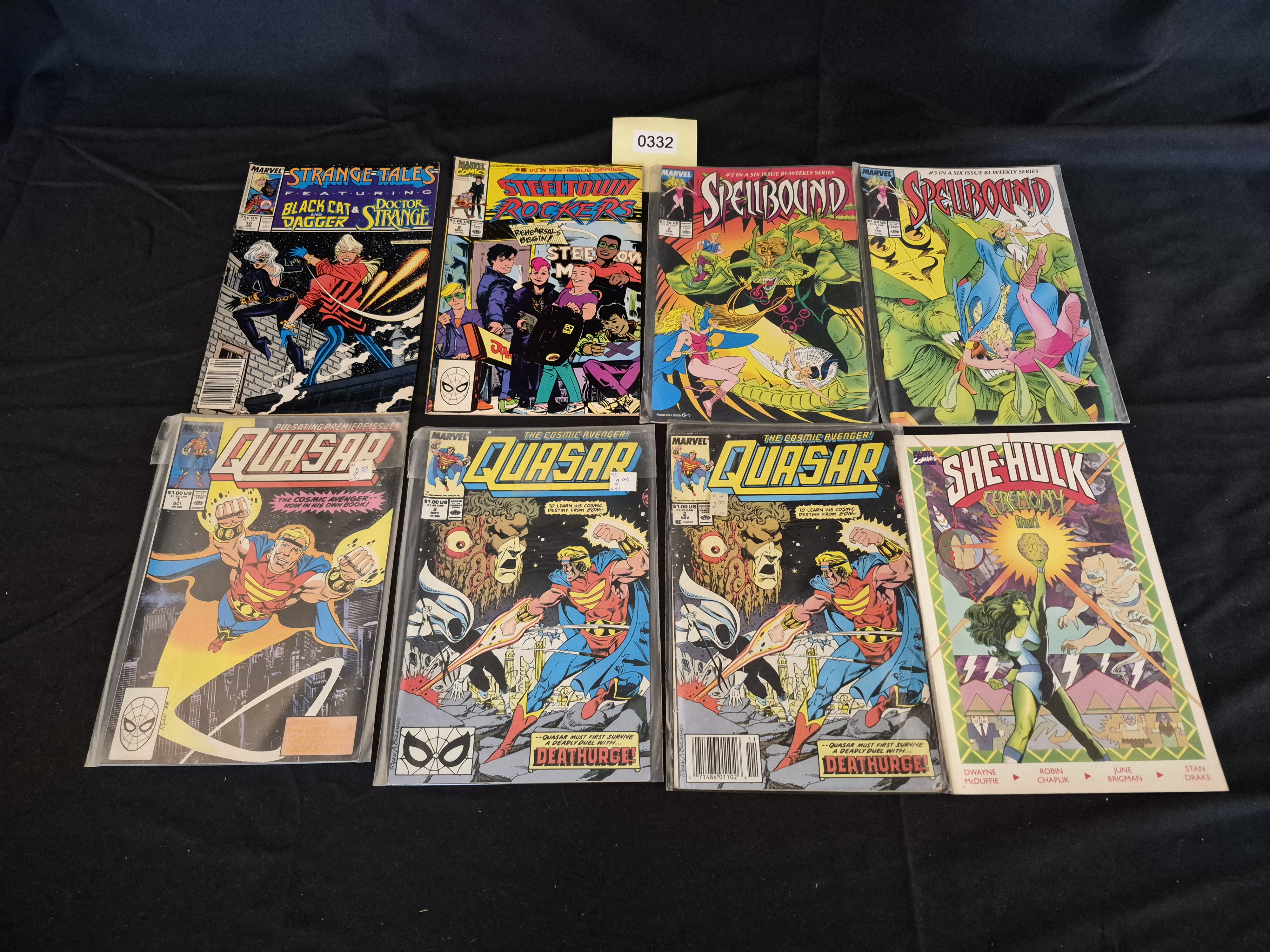 BID PER WHAT YOU SEE IN THE PHOTO, NOT THE AI GENERATED TITLES AND DESCRIPTIONS! A collection of eight modern American paper comic books published predominantly by Marvel Comics, dating from approximately 1989 to 1992. The lot includes three sequential issues of the Marvel title Quasar (No. 1, October 1989; No. 2, November 1989; and No. 3, December 1989), which is a key focus identified in market research. Other titles included are Strange Tales (Jan 1990, featuring Black Cat and Doctor Strange), Steeltown Rockers (No. 2, March 1990), two issues of Spellbound (No. 2 and No. 3), and one issue of She-Hulk: Ceremony (April). The books feature characteristic early 1990s superhero and fantasy artwork. The administrative tag marking 0332 is visible above the center of the grouping.