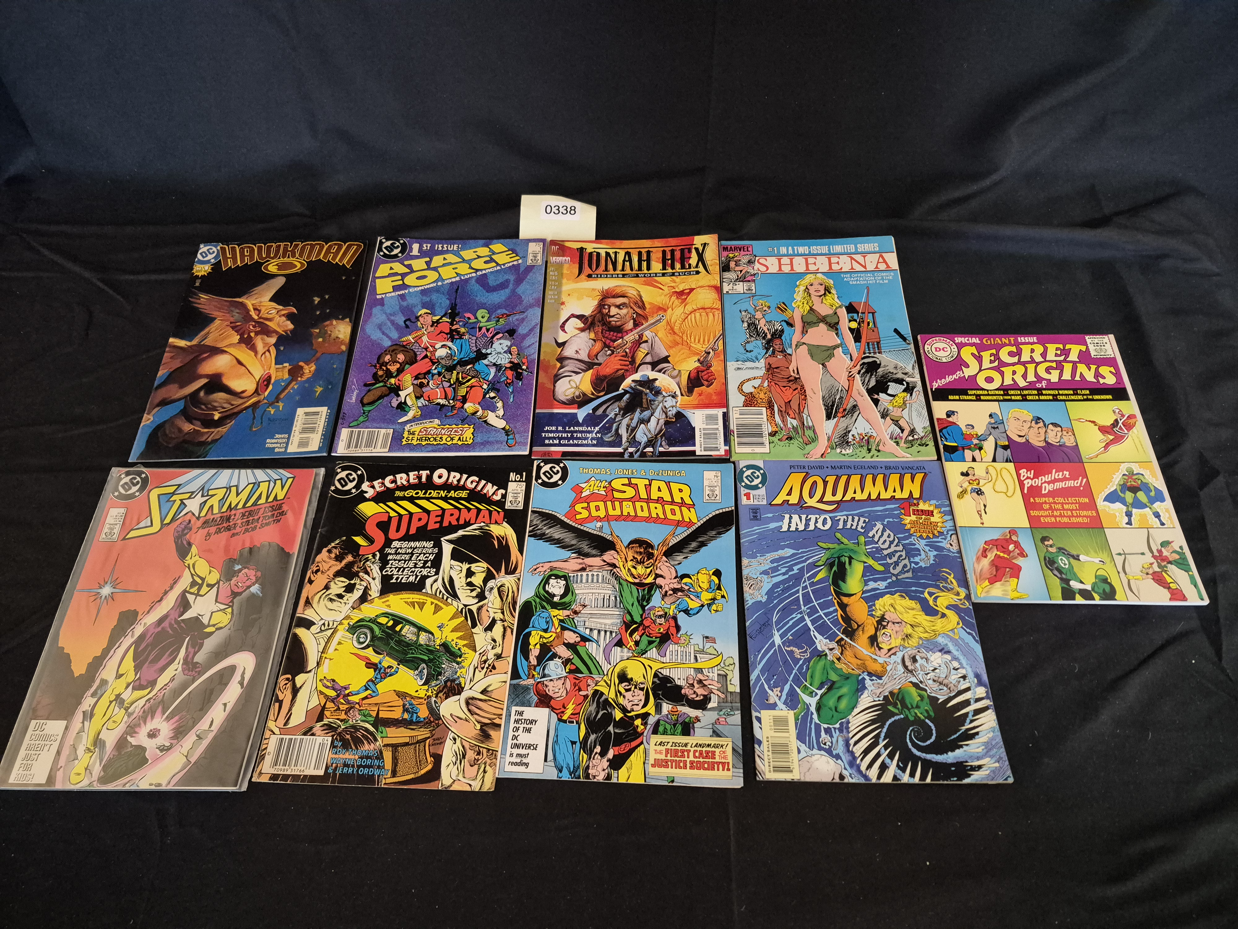 BID PER WHAT YOU SEE IN THE PHOTO, NOT THE AI GENERATED TITLES AND DESCRIPTIONS! A collection of ten American comic books, primarily published by DC Comics, dating to the Copper Age and Early Modern Age (circa 1980s-1990s). The collection is constructed of printed paper and cardstock, featuring vibrant full-color covers. The lot includes several key issues and debuts, notably All-Star Squadron #67 (1987, confirmed by web research as the final issue landmark), Starman (Amazing Debut Issue), Atari Force (1st Issue), Aquaman: Into the Abyss (No. 1), Hawkman, Jonah Hex, and Sheena (#1 in a two-issue limited series, Marvel Comics). Also present are multiple issues of Secret Origins, including two copies of the Special Giant Issue. The items display characteristics consistent with the era, including standard cover prices visible on the covers.
