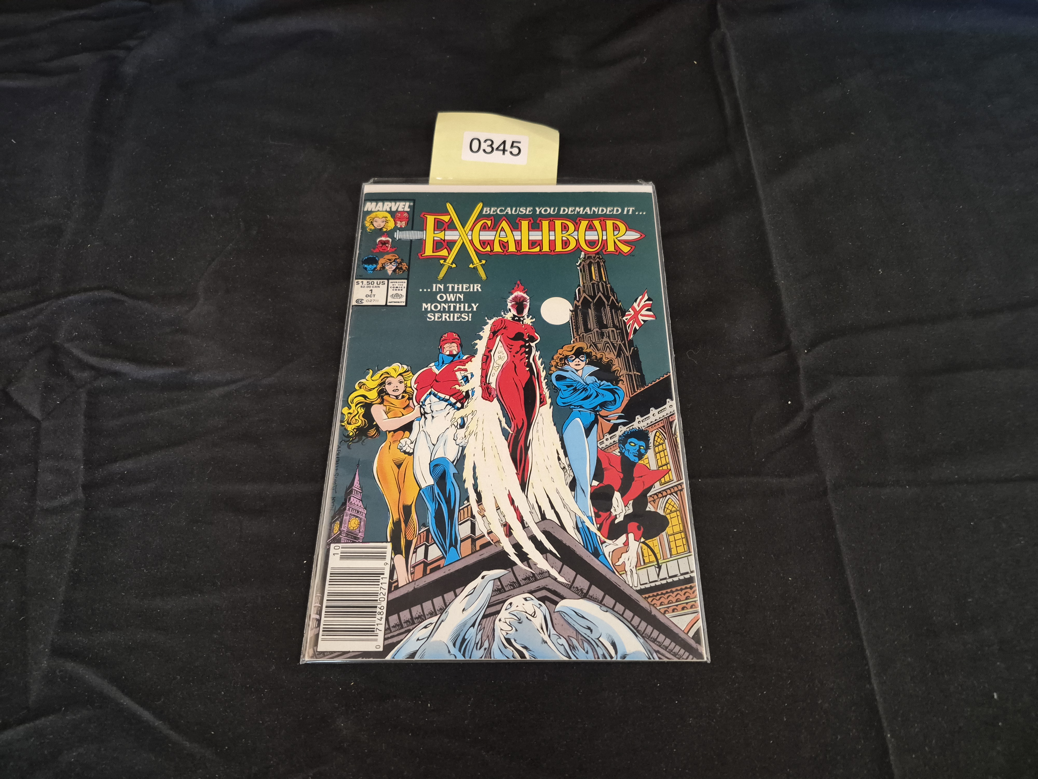 BID PER WHAT YOU SEE IN THE PHOTO, NOT THE AI GENERATED TITLES AND DESCRIPTIONS! A single standard-sized comic book published by Marvel Comics, identified by market consensus as Excalibur Volume 1, Issue #1, dated October 1988. This issue marks the debut of the monthly series, featuring the core team of Captain Britain, Meggan, Nightcrawler, Shadowcat, and Rachel Summers (Phoenix). The full-color cover art depicts the characters standing over London architecture, including a visible Union Jack flag. The cover displays the original US price of $1.50 and the Canadian price of $2.00. Visible markings include the Marvel logo, the Comics Code Authority (CCA) seal, and a barcode displaying the code 02711. The comic is currently protected within a clear plastic sleeve and backing board.