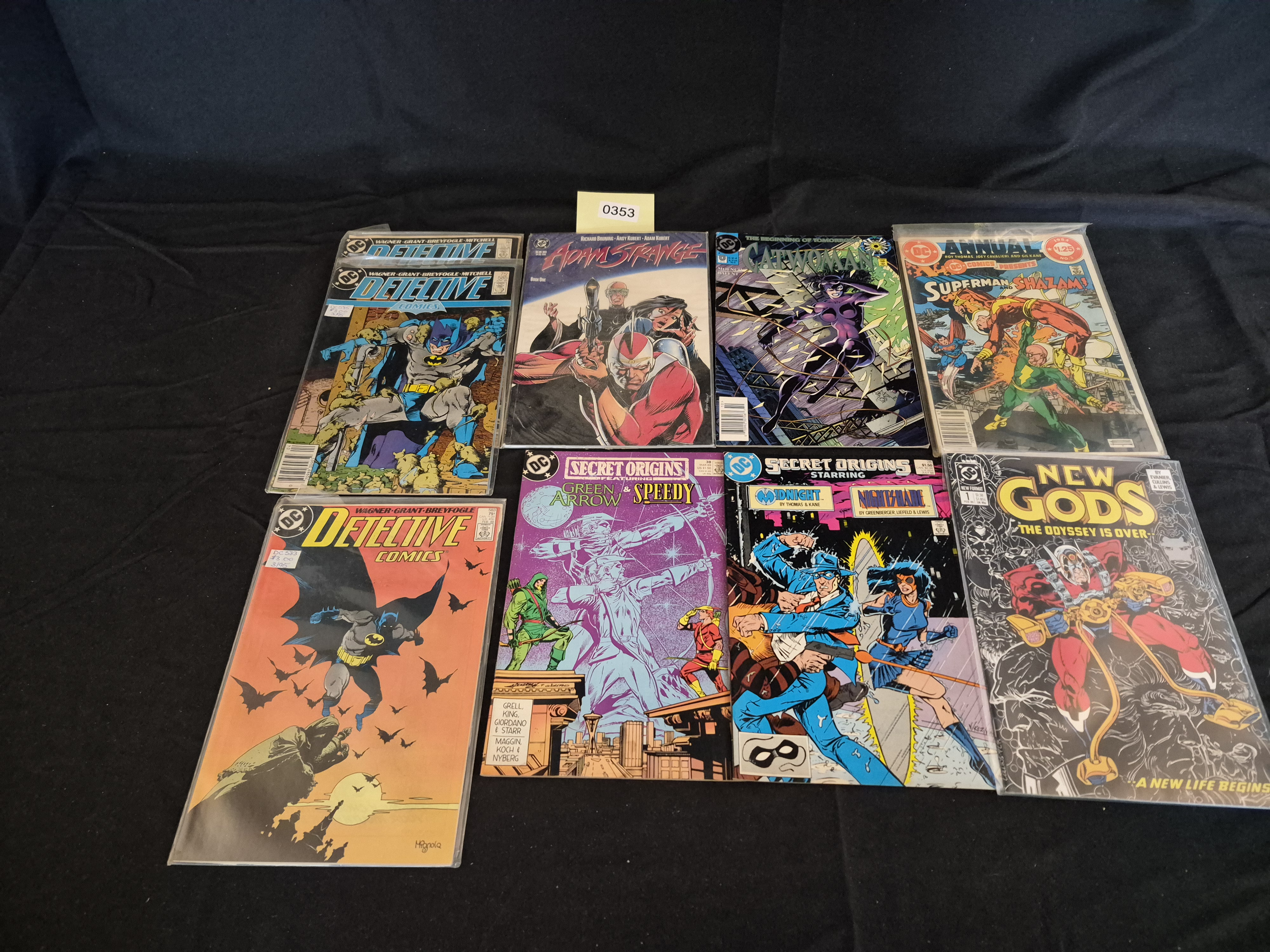 BID PER WHAT YOU SEE IN THE PHOTO, NOT THE AI GENERATED TITLES AND DESCRIPTIONS! The lot consists of a collection of 8 vintage DC Comics comic books, primarily published during the late Copper and early Modern Ages (mid-1980s to early 1990s). The comics are printed in four-color on standard paper stock and are housed in protective plastic sleeves. The collection includes a variety of titles from the DC universe. Specific issues visible include two issues of Detective Comics (one priced at 75 cents and one at $1.00), Adam Strange (Book One), Catwoman (The Beginning of Tomorrow, $1.50), Annual DC Comics Presents Superman and Shazam! (1984, No. 3), and New Gods: The Odyssey is Over (New Format, $3.00). The collection highlights two issues of Secret Origins, one of which is Secret Origins #38 (March 1989), featuring Green Arrow and Speedy, associated with writer Mike Grell. The second Secret Origins issue stars Midnight and Nightshade.