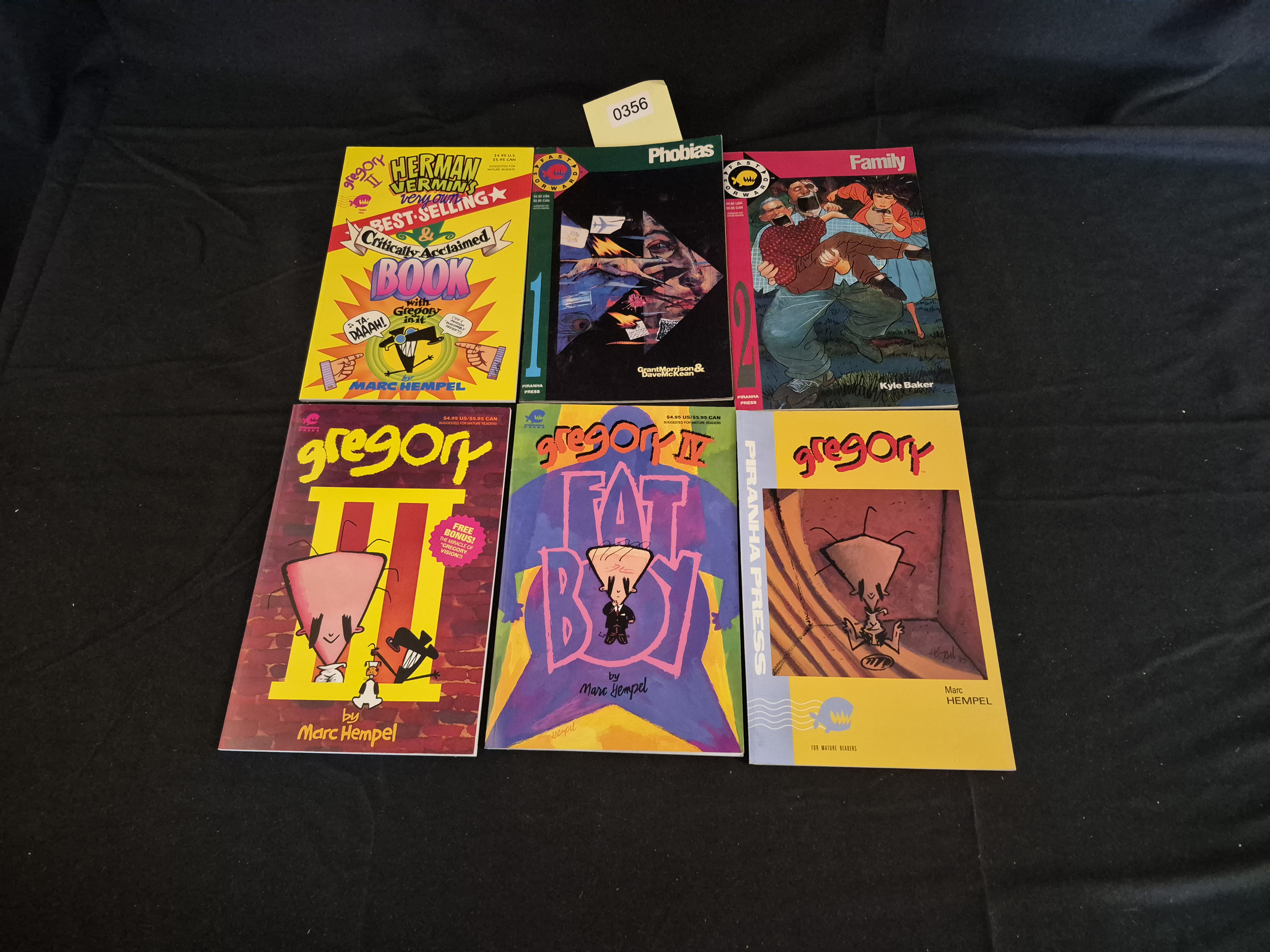 BID PER WHAT YOU SEE IN THE PHOTO, NOT THE AI GENERATED TITLES AND DESCRIPTIONS! A collection of six softcover comic books and graphic novels published under the Piranha Press imprint of DC Comics, dating primarily from the late 1980s and early 1990s. The lot is centered around the work of Marc Hempel and includes four volumes from the Gregory series: Gregory I, Gregory II (Herman Vermin’s Best-Selling & Critically Acclaimed Book), Gregory III, and Gregory IV: Fat Boy (1993). Also included are two initial issues from the Piranha Press Fast Forward line: Phobias (Issue 1) by Grant Morrison and Dave McKean, and Family (Issue 1) by Kyle Baker. The books feature brightly colored, stylized cover art and are secured by staple or saddle-stitch binding.