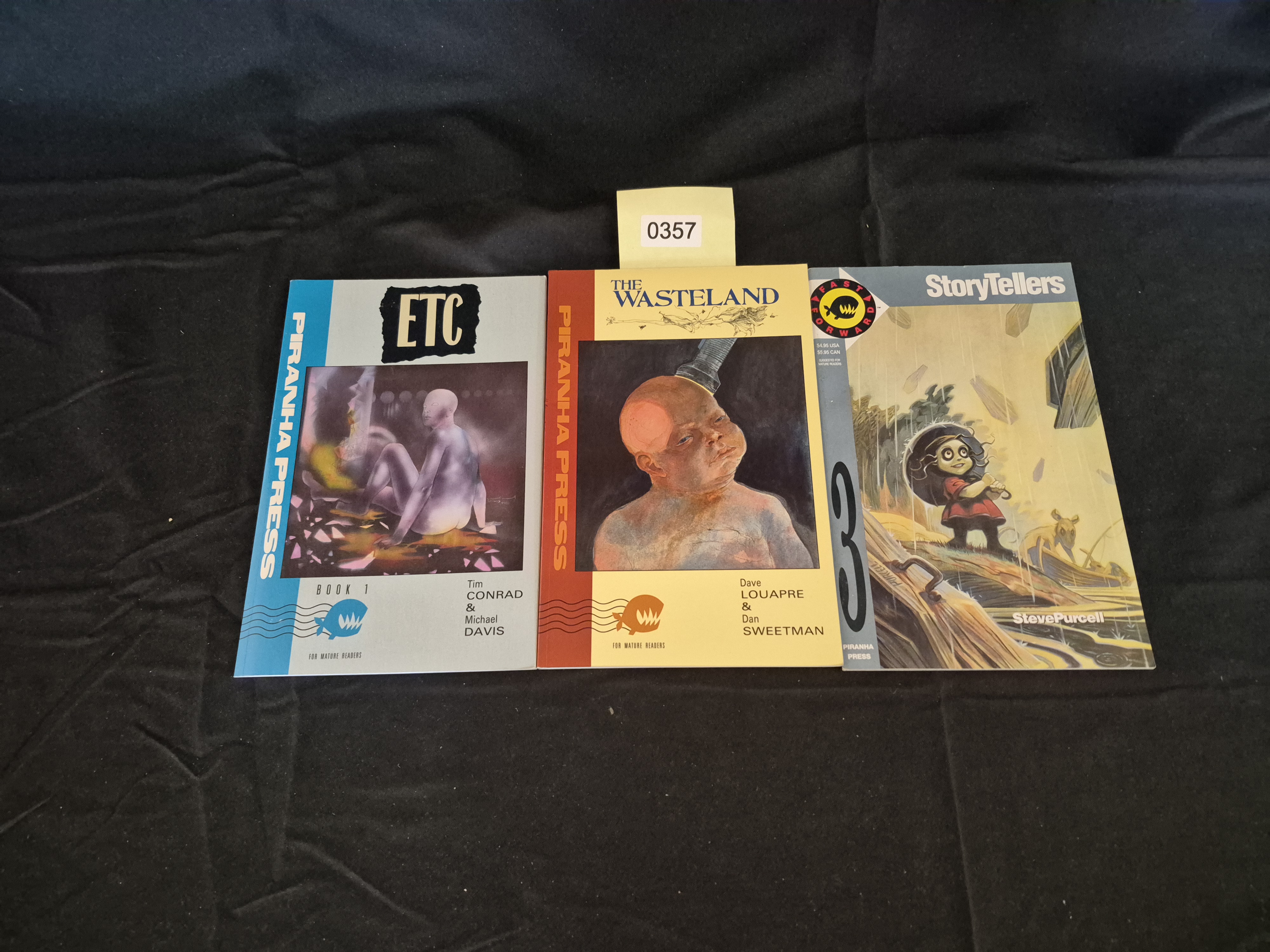 BID PER WHAT YOU SEE IN THE PHOTO, NOT THE AI GENERATED TITLES AND DESCRIPTIONS! A collection of three softcover graphic novels, or trade paperbacks, published by Piranha Press, a division of DC Comics, circa 1989-1990. The books are constructed of paper and cardstock and feature modern comic illustration styles, all designated “For Mature Readers.” The lot includes three distinct titles: *ETC Book 1* by Tim Conrad and Michael Davis, featuring an abstract, ethereal cover illustration; *The Wasteland* by Dave Louapre and Dan Sweetman, which displays a stylized illustration of an infant’s head under harsh light; and *StoryTellers 3* by Steve Purcell, featuring a distinctive dark cartoon illustration. The central volume, *The Wasteland*, bears a cataloging sticker marked “0357” affixed to the cover.