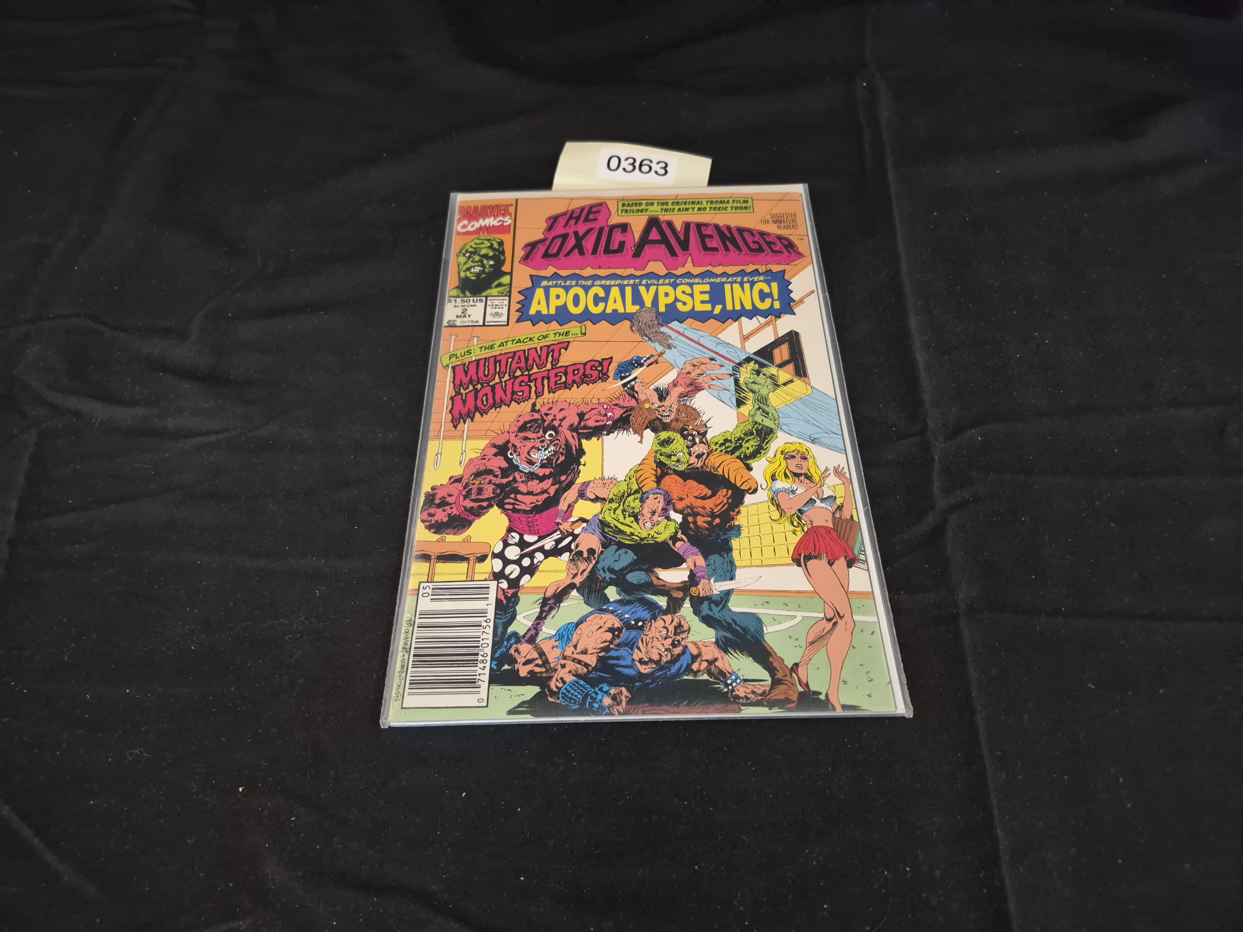 BID PER WHAT YOU SEE IN THE PHOTO, NOT THE AI GENERATED TITLES AND DESCRIPTIONS! A single comic book identified through market consensus as Marvel Comics’ The Toxic Avenger, Issue #2. The comic book features the main story “Apocalypse, Inc.!” and the feature “The Attack of the… Mutant Monsters!” The cover art depicts the Toxic Avenger and several monstrous figures engaged in combat with humans, referencing the original Troma film trilogy. Visible markings include the Marvel Comics logo, a Comics Code Authority seal, and a cover price of $1.50 US. The date code visible on the cover is May. The item is protected within a clear plastic archival sleeve, which bears a white inventory sticker numbered “0363.”