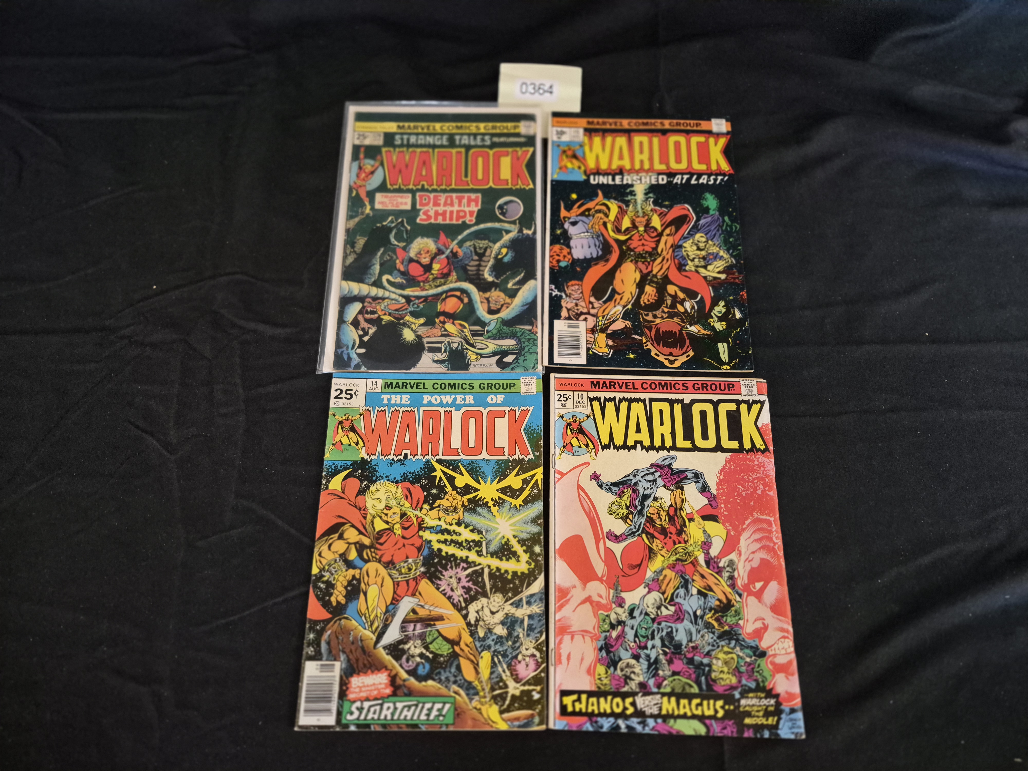 BID PER WHAT YOU SEE IN THE PHOTO, NOT THE AI GENERATED TITLES AND DESCRIPTIONS! A collection of four (4) Bronze Age Marvel Comics featuring the character Warlock (Adam Warlock), published by Marvel Comics Group in the mid-1970s. The lot includes key issues from the Warlock series, often associated with the Jim Starlin run. Specific issues visible include Warlock #10 (25¢ cover price, featuring “Thanos Versus The Magus,” identified via web intelligence as containing the first appearance of the In-Betweener and the Origin of Magus), The Power of Warlock #14 (25¢ cover price), and two additional issues: one titled “Strange Tales featuring Warlock: Death Ship!” (25¢ cover price visible) and one titled “Warlock: Unleashed – At Last!” (30¢ cover price visible). All comics display colorful illustrative artwork typical of the period and are individually housed in clear plastic sleeves. A white inventory label marked “0364” is affixed above the top row.