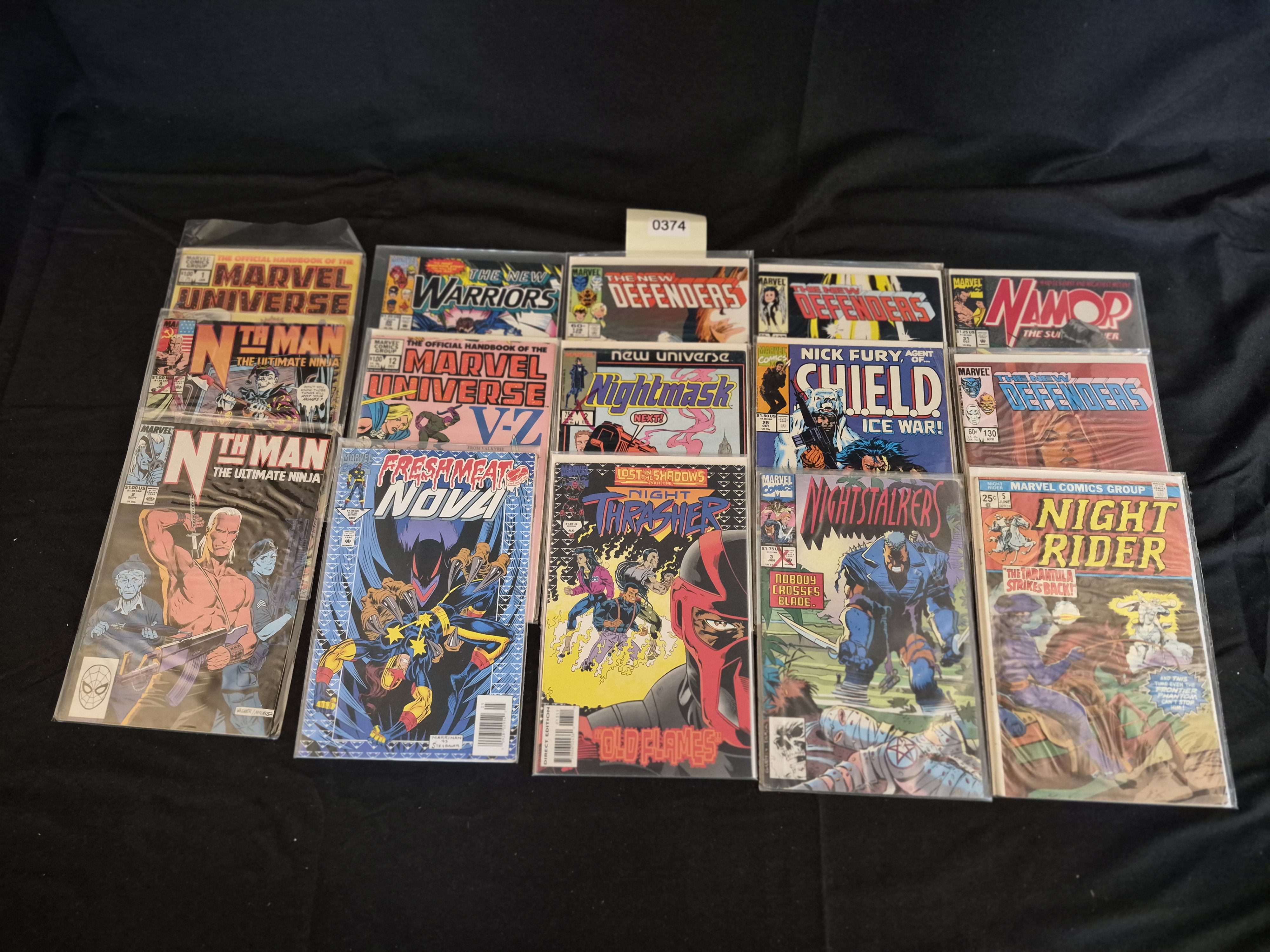 BID PER WHAT YOU SEE IN THE PHOTO, NOT THE AI GENERATED TITLES AND DESCRIPTIONS! A collection of 13 comic books and reference handbooks published by Marvel Comics, primarily dating from the Copper Age through the Modern Age (late 1970s to 1990s). The mixed lot includes various titles and characters such as Namor the Sub-Mariner, Nick Fury, Agent of S.H.I.E.L.D., The New Warriors, The New Defenders, Nightstalkers (featuring Blade), Night Thrasher, Nova (Freshmeat Nova), Nth Man, and Night Rider. The lot also contains reference materials, including The Official Handbook of the Marvel Universe. The comics feature bright, full-color cover art. Visible cover price points range from 25 cents to $1.75 US, reflecting the varied publication dates within the collection. An inventory sticker marked 0374 is visible near the center top of the arrangement.