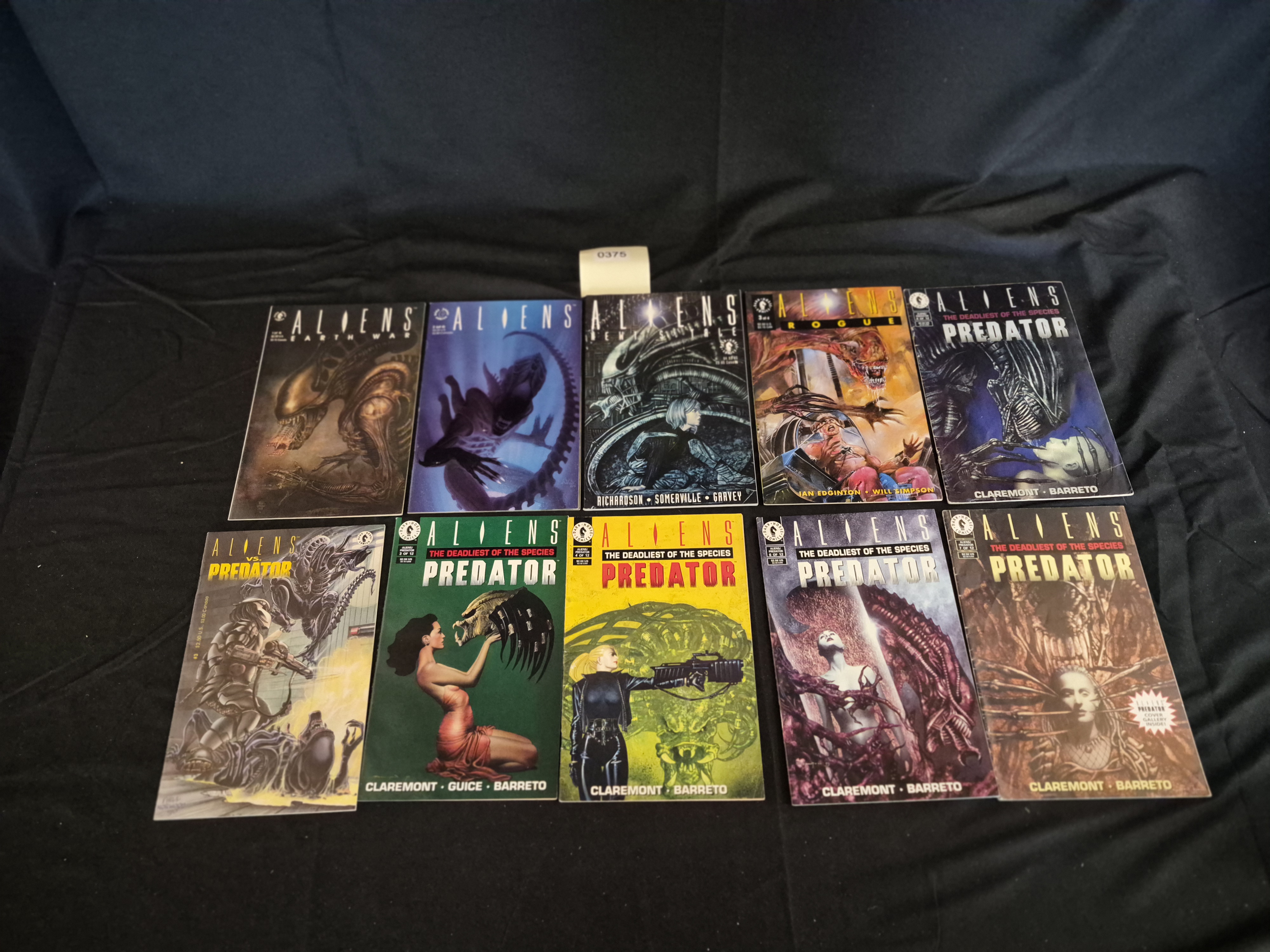 BID PER WHAT YOU SEE IN THE PHOTO, NOT THE AI GENERATED TITLES AND DESCRIPTIONS! The collection consists of 10 modern comic books published by Dark Horse Comics, centered around the Aliens and Predator science fiction/horror franchises. The lot includes various issues of Aliens, Aliens vs. Predator, and a sequence of issues from the Aliens vs. Predator: The Deadliest of the Species miniseries (including issues 2 through 5 of 12 visible in the lower row). Visible creator credits include Chris Claremont, Javier Barreto, Ian Edgington, Will Simpson, Richardson, Somerville, and Garvey. The comics are standard stapled paper editions with full-color, graphically illustrated covers. An inventory tag marked “0375” is visible within the lot arrangement.