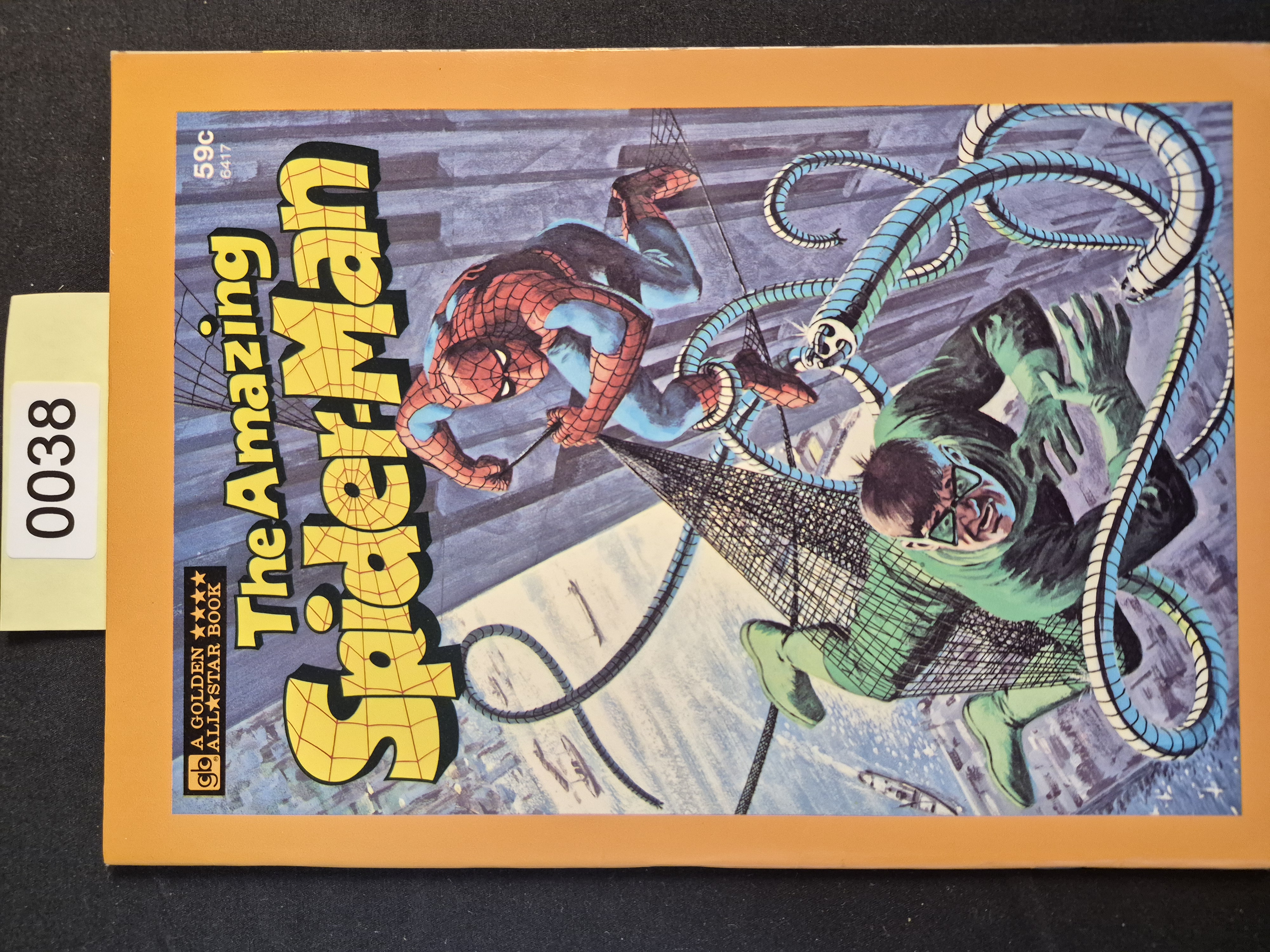 BID PER WHAT YOU SEE IN THE PHOTO, NOT THE AI GENERATED TITLES AND DESCRIPTIONS! A single softcover book titled The Amazing Spider-Man, identified through market consensus as a Golden All Star Book published by Golden Press circa 1977. The book features a full-color cover illustration depicting Spider-Man swinging into action against the villain Doctor Octopus above a large city setting. The cover art is framed by a broad orange border. Visible markings include the Golden Books gb logo, the phrase A GOLDEN ALL★STAR BOOK, the original price of 59c, and the stock number 6417.
