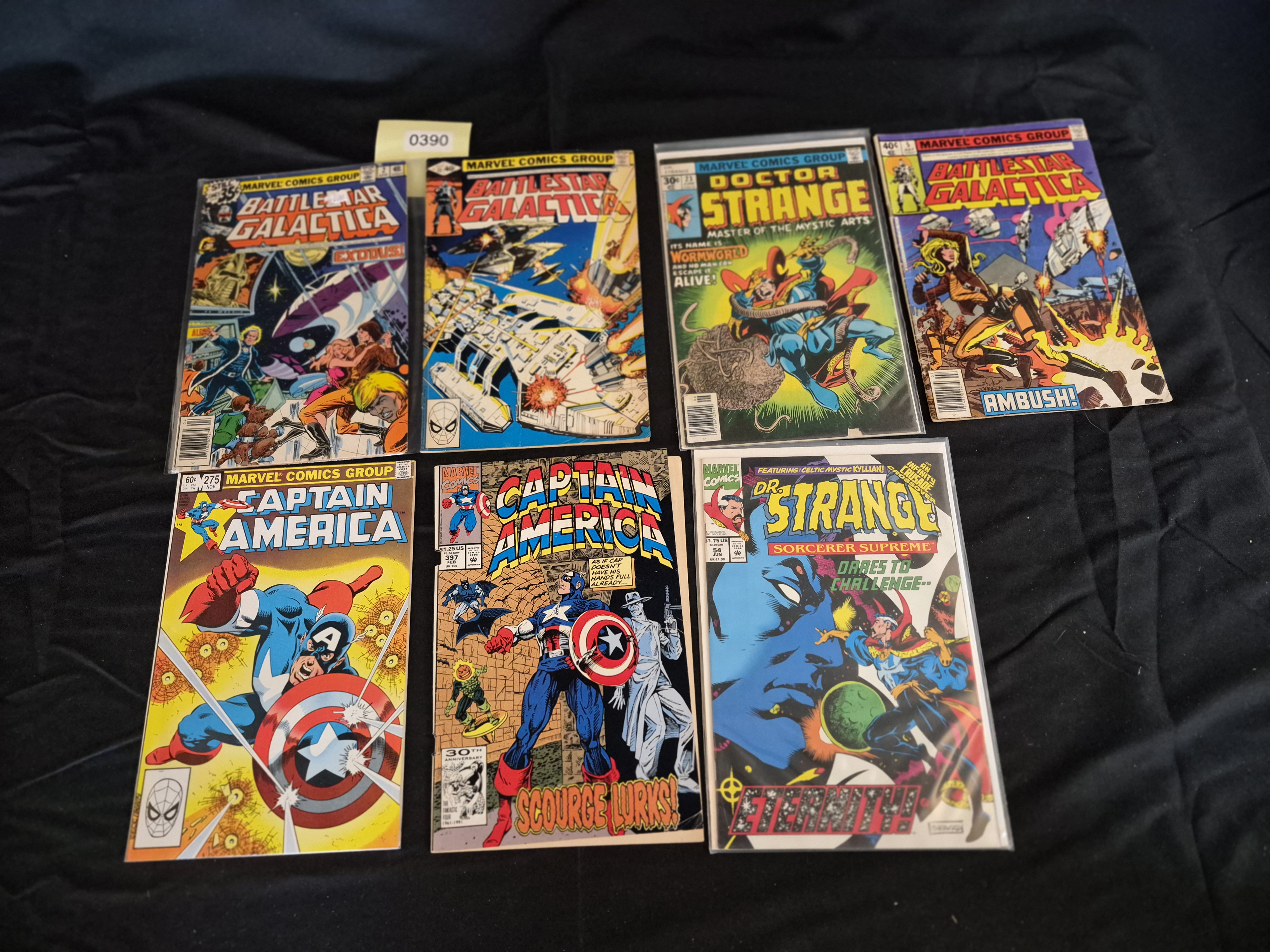 BID PER WHAT YOU SEE IN THE PHOTO, NOT THE AI GENERATED TITLES AND DESCRIPTIONS! A collection of seven American comic books published by Marvel Comics Group, spanning the late Bronze Age through the Copper/Early Modern Age (circa 1970s to 1990s). The lot includes four issues of Battlestar Galactica (one issue visible with a 40c price tag) and three superhero titles. The superhero titles include two issues of Captain America (one with a 60c price tag, and Captain America Vol. 1 #397, Feb 1992, featuring the 30th Anniversary of the Fantastic Four, with a $1.25 price tag). Also included are two issues of Doctor Strange, one titled Master of the Mystic Arts (visible with a 30c price tag, issue #73) and one titled Sorcerer Supreme (visible with a $1.75 price tag, issue #54, featuring an Infinity Crusade crossover). The comics are presented against a black cloth background with a yellow inventory tag marked 0390 visible.