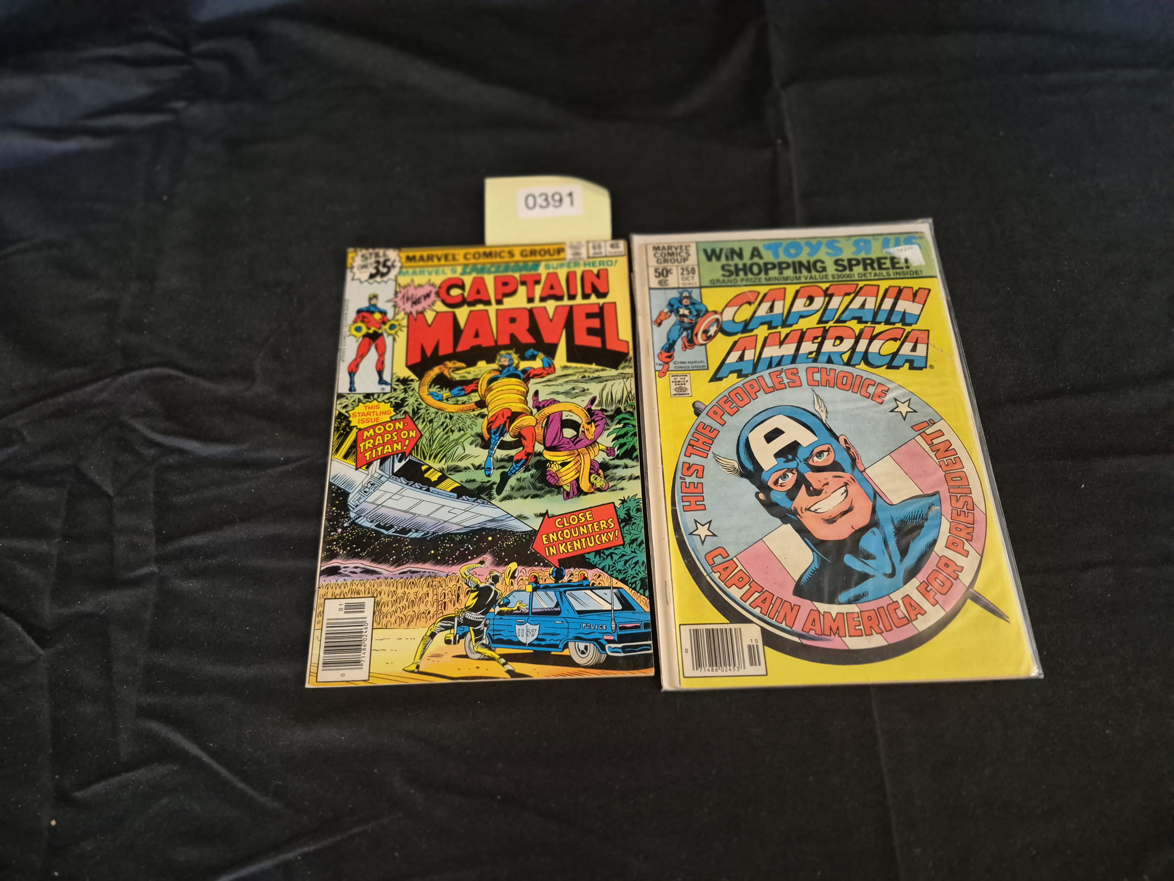 BID PER WHAT YOU SEE IN THE PHOTO, NOT THE AI GENERATED TITLES AND DESCRIPTIONS! A pair of vintage American comic books published by the Marvel Comics Group. The first comic, identified through market consensus, is Captain Marvel #60 (January 1979, 35¢ cover price), featuring dynamic cover art depicting Captain Marvel engaging aliens near a spacecraft and a police car, with the text callout “MOON-TRAPS ON TITAN!” The second comic is Captain America #250 (October 1980, 50¢ cover price), featuring a bold, yellow cover focused on Captain America’s face within a circular red, white, and blue motif, promoting the storyline “CAPTAIN AMERICA FOR PRESIDENT!” Both comics are printed on paper/cardstock and are individually sleeved or bagged. A yellow inventory tag bearing the number “0391” is present in the lot.