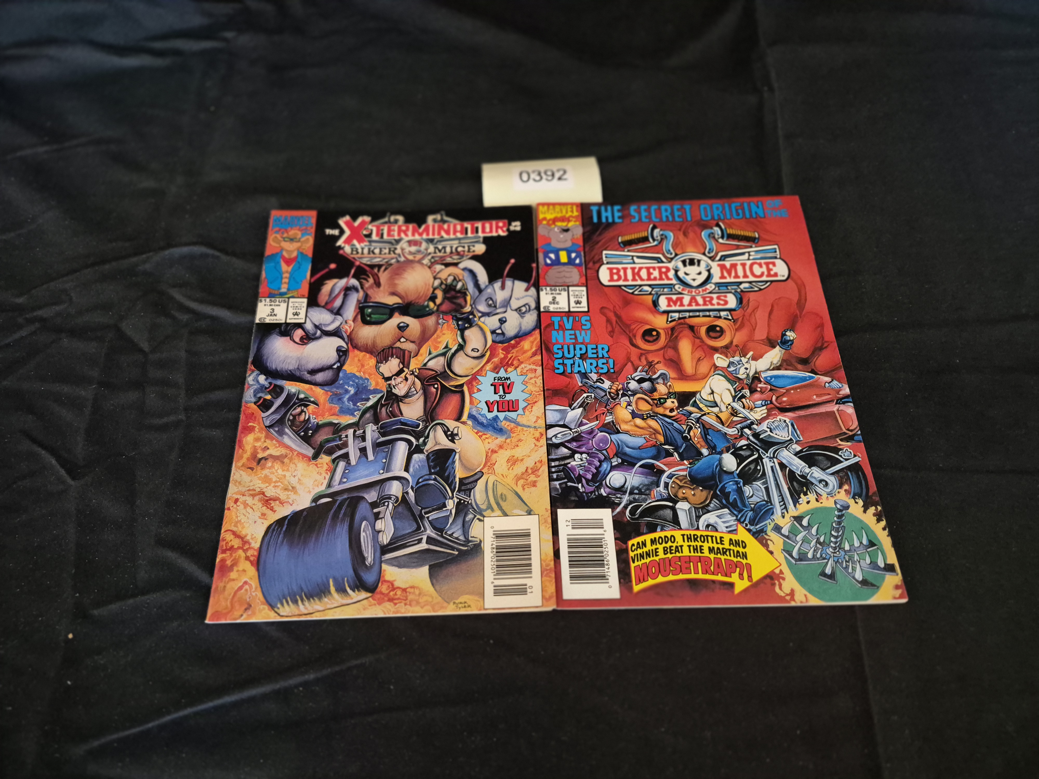 BID PER WHAT YOU SEE IN THE PHOTO, NOT THE AI GENERATED TITLES AND DESCRIPTIONS! A pair of comic books from the Marvel Comics Biker Mice from Mars series, published circa 1993. The lot includes Issue 2, titled “THE SECRET ORIGIN OF THE BIKER MICE FROM MARS” (marked DEC), and Issue 3, titled “THE X-TERMINATOR: BIKER MICE FROM MARS” (marked JAN). Both periodicals feature full-color cartoon illustrations of anthropomorphic mouse characters on futuristic motorcycles. Each issue carries a cover price of $1.50 US. Visible promotional text includes references to the television show, such as “TV’S NEW SUPER STARS!” and “THE MARTIAN MOUSETRAP?!”.