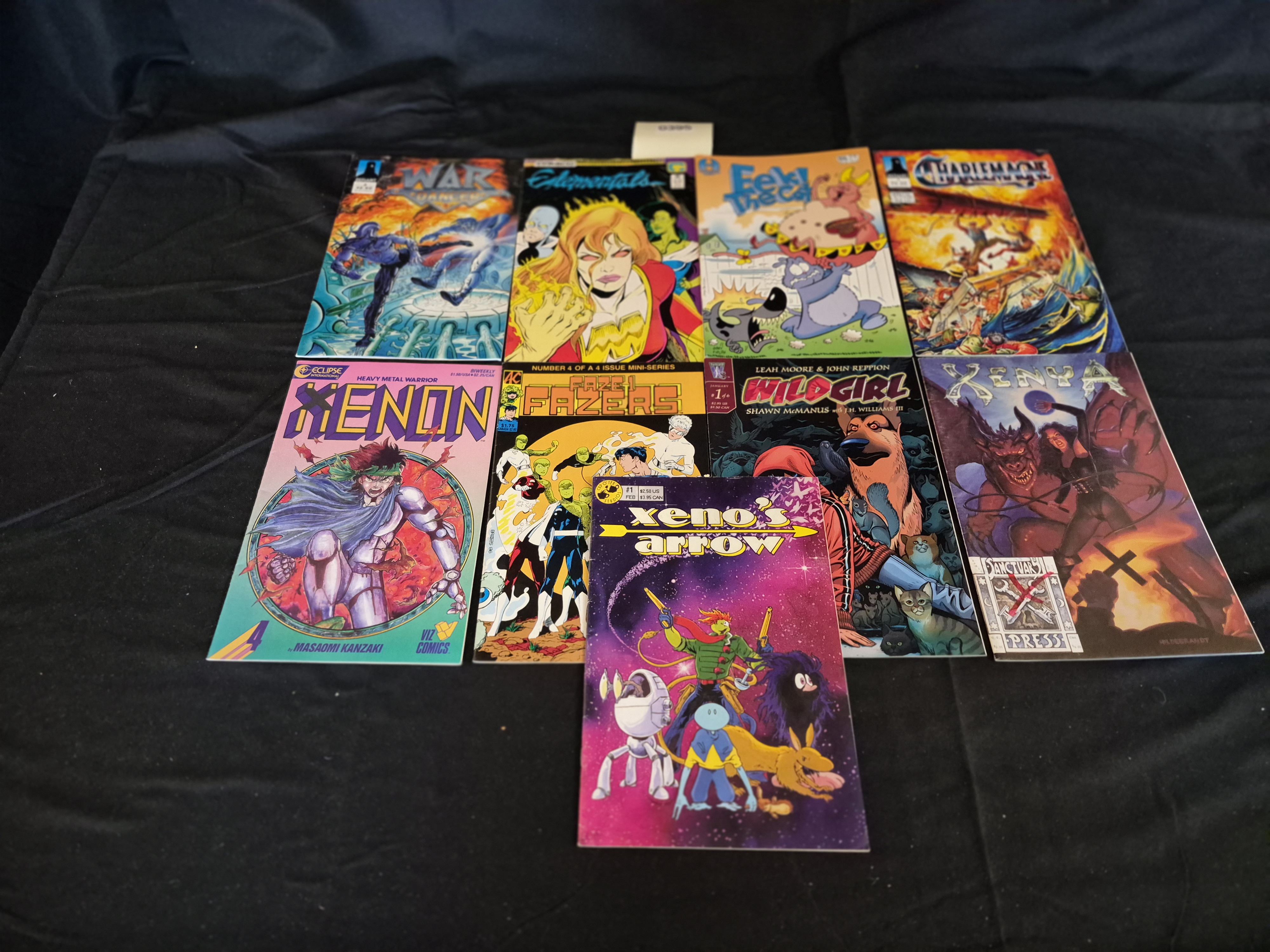 BID PER WHAT YOU SEE IN THE PHOTO, NOT THE AI GENERATED TITLES AND DESCRIPTIONS! A collection of nine individual modern comic books and graphic magazines, predominantly featuring science fiction and fantasy themes. The lot includes varied independent and genre titles published by companies such as Viz Comics, Eclipse, and Kitchen Sink Press. Specific titles visible include WAR CHAMELEON, Elemental, Fect! the Cat, XENON (Eclipse International/Viz Comics), FAZE-1 FAZERS, WILD GIRL, XENYA, and Xeno’s Arrow. The title Xeno’s Arrow is associated in market research with creator Greg Beettam and publisher Cup O’ Tea Studios. The items feature colorful, full-cover illustrations and are standard paperback comic format.