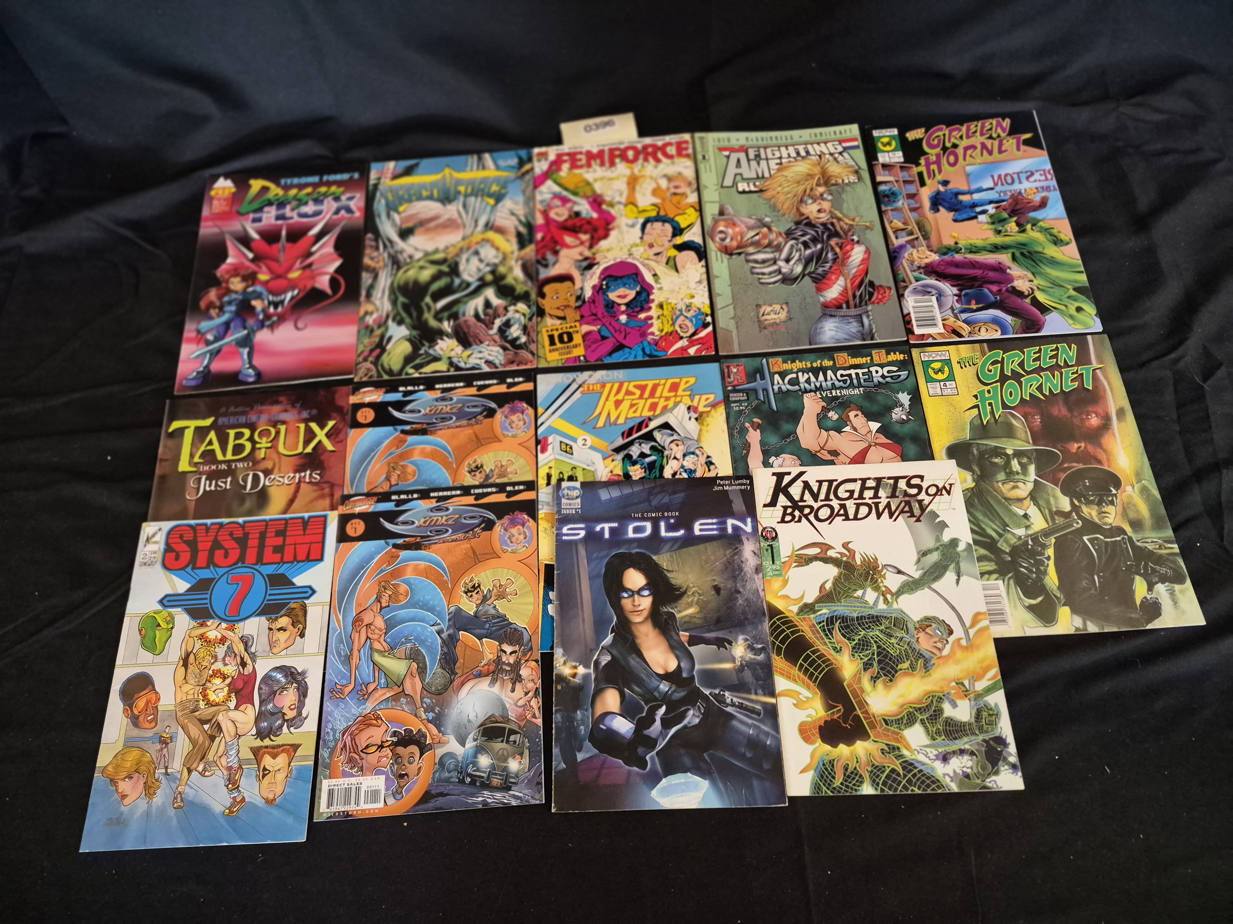 BID PER WHAT YOU SEE IN THE PHOTO, NOT THE AI GENERATED TITLES AND DESCRIPTIONS! A collection of 15 individual comic books and graphic periodicals, primarily dating to the late 20th or early 21st century and featuring titles from independent and smaller publishers. Each item is constructed of printed paper with a glossy cardstock cover, displaying full-color illustrations typical of the Modern Age of comics. The collection covers various genres including superhero, adventure, and fantasy. Visible publication markings include issue numbers, bar codes, and original price points ranging from $2.95 to $4.95. The lot includes notable titles such as Femforce Special 10th Anniversary Issue, Fighting American, The Green Hornet (Issues #1 and #4 are visible), System 7 (#2), Knights of the Dinner Table Hackmasters, Justice Machine, Taboo Just Deserts Book Two, Dragon Force, Stolen, and two visible copies of KMKZ Issue #1. The collection is displayed loose on a dark cloth background. A small slip of paper marked “0396” is visible within the arrangement.
