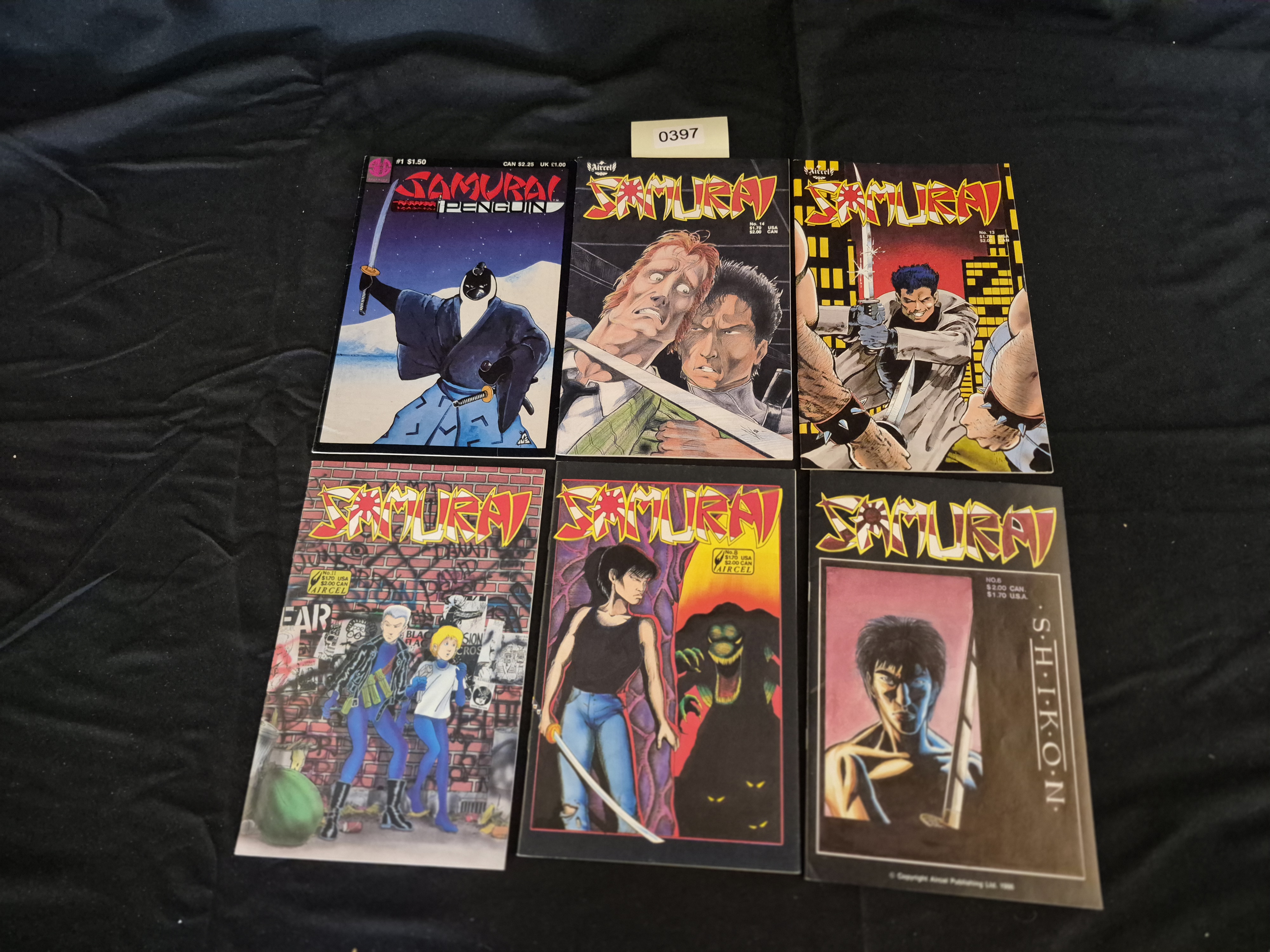 BID PER WHAT YOU SEE IN THE PHOTO, NOT THE AI GENERATED TITLES AND DESCRIPTIONS! A collection of six independent comic books from the Samurai series published by Aircel Publishing, dating primarily to the late 1980s. Web intelligence suggests the series features work by creators such as Barry Blair. The lot includes various numbered issues of Samurai and related titles, including Samurai Penguin #1, Samurai No. 14, Samurai No. 13, Samurai No. 11, Samurai No. 8, and one volume titled S H I K O N. The cover art displays a stylized action and martial arts aesthetic. The volume marked S H I K O N bears a visible copyright of Aircel Publishing Ltd. 1986. The publications are printed on paper.