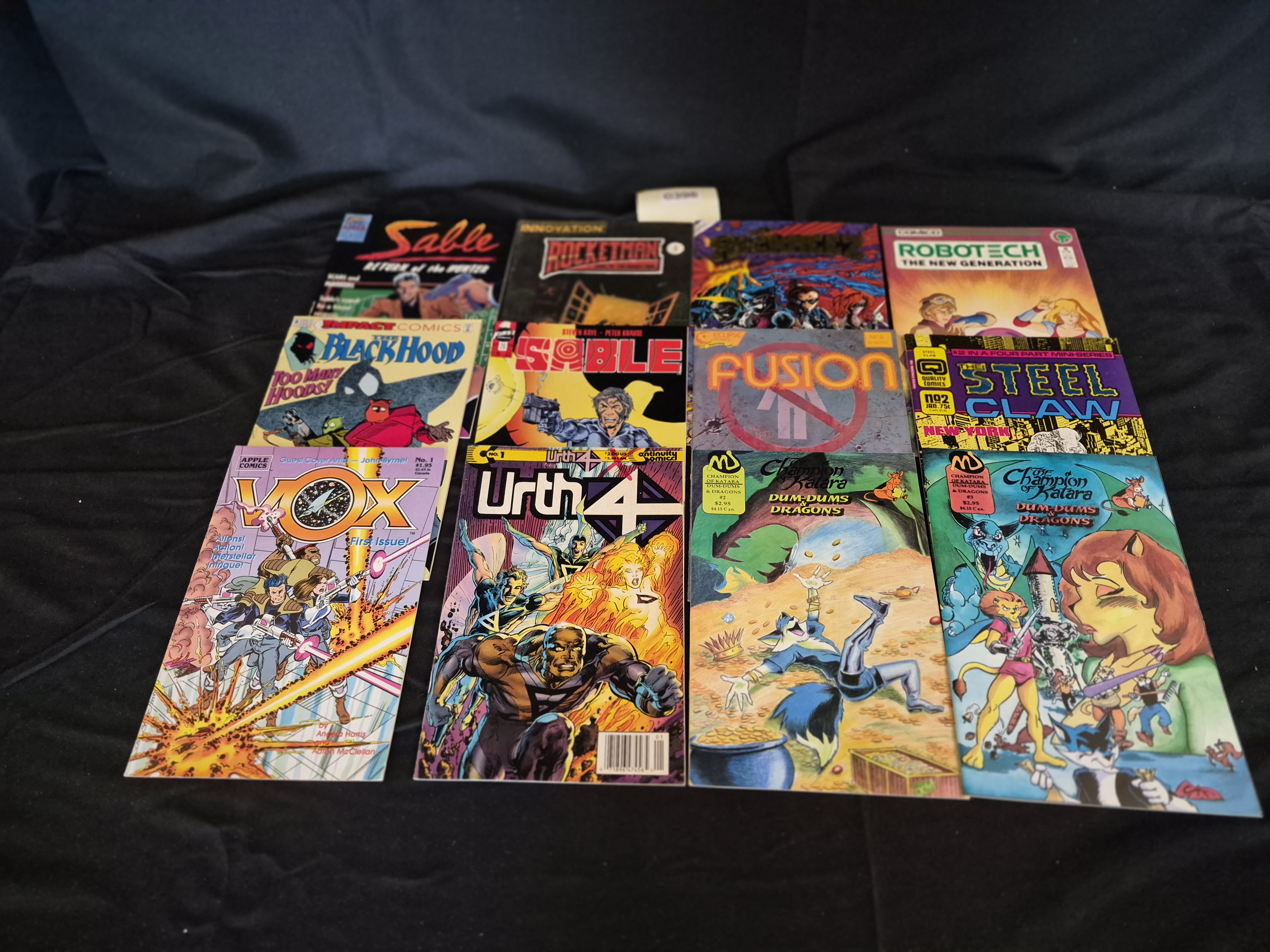 BID PER WHAT YOU SEE IN THE PHOTO, NOT THE AI GENERATED TITLES AND DESCRIPTIONS! A collection of twelve standard saddle-stitched comic pamphlets, primarily dating from the Copper Age or early Modern Age (late 1980s to early 1990s). The items feature full-color printed paper covers and represent various independent and small-press publishers, including Impact Comics, Innovation, Eclipse, Apple Comics, and MU. The lot covers genres such as science fiction, fantasy, and action/adventure. Specific titles identified within the collection include two issues of Sable, Black Hood, Rocketman, Robotech: The New Generation, Fusion, Steel Claw, Vox (First Issue), Urth 4 (No. 1), and two issues of The Champion of Katara Dum-Dums & Dragons (issues #2 and #3).