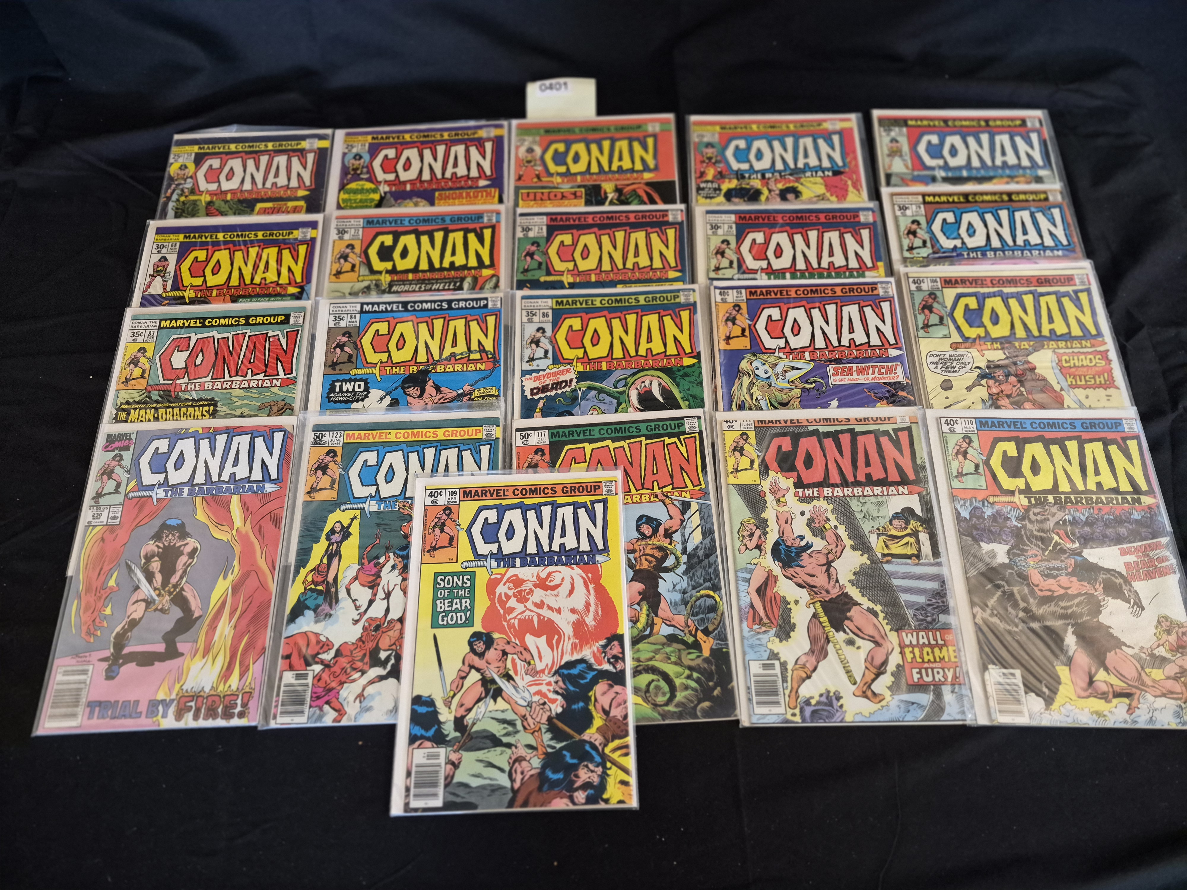 BID PER WHAT YOU SEE IN THE PHOTO, NOT THE AI GENERATED TITLES AND DESCRIPTIONS! The lot consists of a collection of 20 individual comic books published by the Marvel Comics Group, featuring the title Conan the Barbarian. The issues span the Bronze Age through the early Copper Age of comics publishing, evidenced by visible cover prices ranging from 25 cents up to $1.00. The collection includes various issues from the 1970s through the 1990s, consistent with market listings for this title and era. Each comic book is protected in a clear plastic sleeve. The covers feature full-color illustrations typical of the period, depicting the titular character in various action scenes.