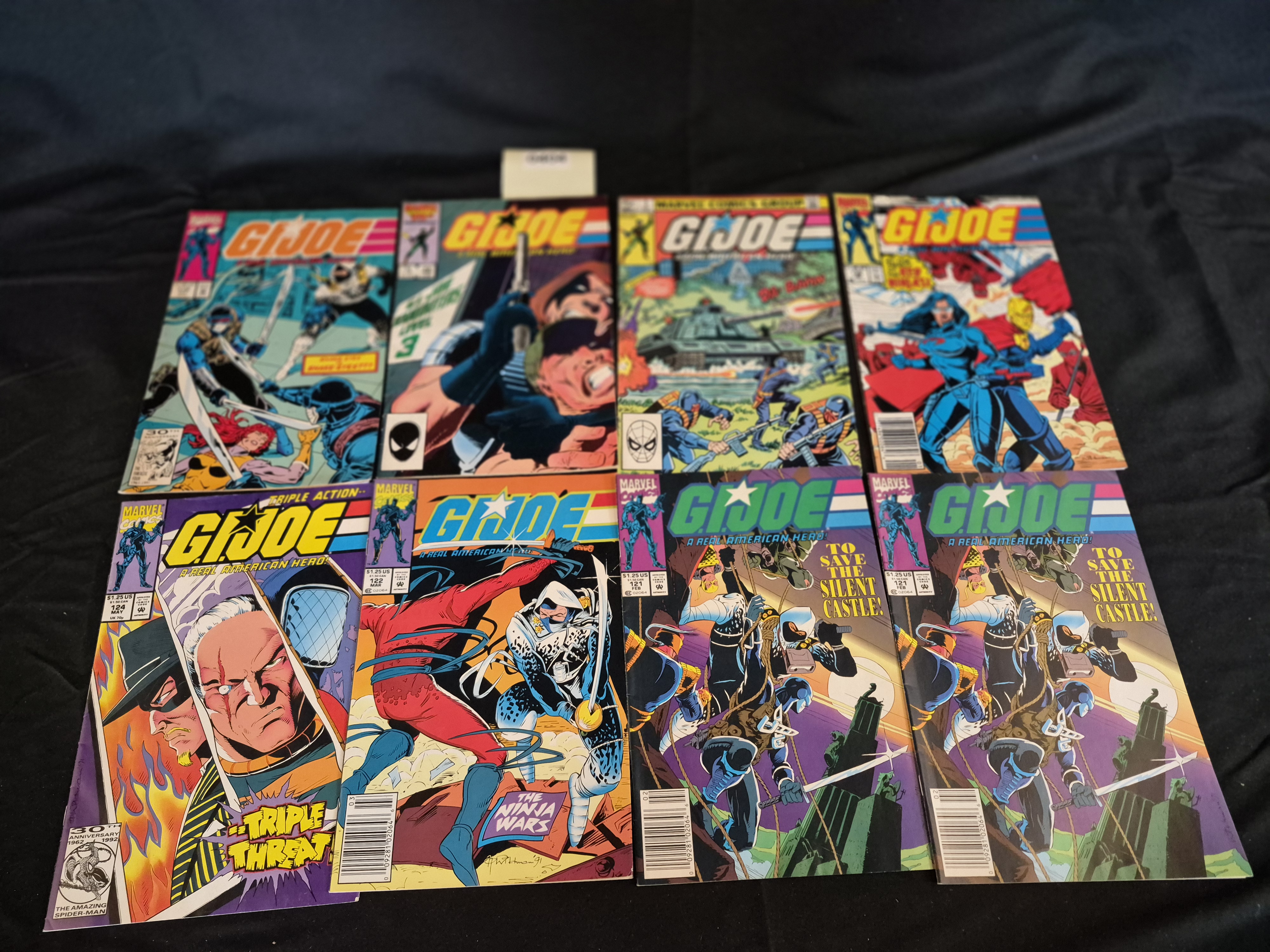 BID PER WHAT YOU SEE IN THE PHOTO, NOT THE AI GENERATED TITLES AND DESCRIPTIONS! A collection of eight vintage comic books published by Marvel Comics, featuring the title G.I. Joe A Real American Hero (ARAH). The issues are from the early 1990s, placing them in the Copper/Modern Age of comics. Visible issue numbers include #121, #122, and #124, covering story arcs such as The Ninja Wars, Triple Threat, and To Save The Silent Castle! The items are constructed of printed paper stock with full-color illustrations. Visible cover markings include the Marvel Comics logo, the Comics Code Authority seal, UPC barcodes, and the original cover price of $1.25 US. One issue cover bears a 30th Anniversary (1962-1992) stamp for The Amazing Spider-Man.