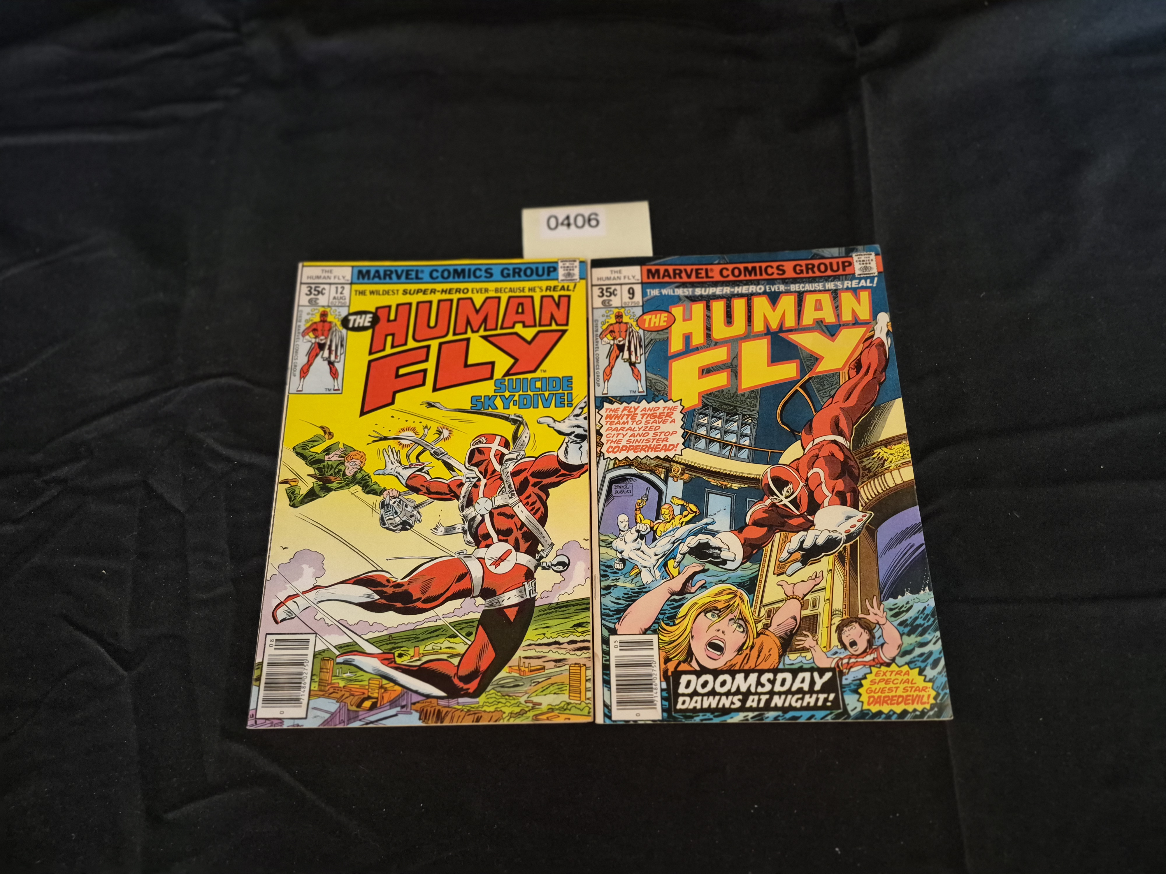 BID PER WHAT YOU SEE IN THE PHOTO, NOT THE AI GENERATED TITLES AND DESCRIPTIONS! The lot consists of two Bronze Age comic books from the Marvel Comics Group series, The Human Fly. Both issues are 35 cent cover price copies, dating them to the late 1970s. The items are constructed of printed paper and feature the Comics Code Authority seal and printed barcodes. Issue #9 (MAY) features the story title “DOOMSDAY DAWNS AT NIGHT!” and includes an appearance by the guest star Daredevil. Issue #12 (AUG) features the cover title “SUICIDE SKY-DIVE!”. Both covers depict the title character in his distinct red suit.