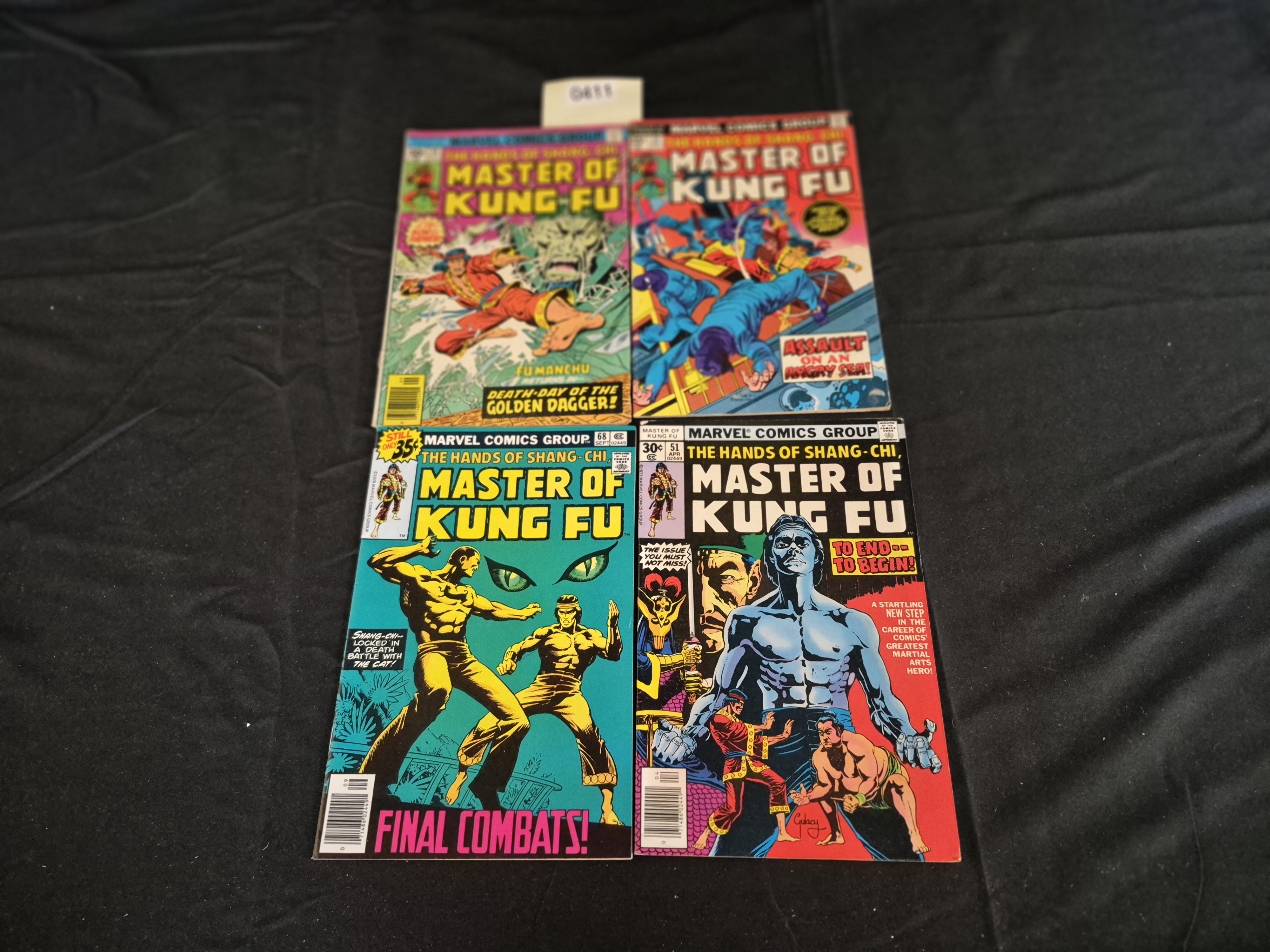 BID PER WHAT YOU SEE IN THE PHOTO, NOT THE AI GENERATED TITLES AND DESCRIPTIONS! A collection of four vintage American comic books published by the Marvel Comics Group, titled The Hands of Shang-Chi: Master of Kung Fu. These periodicals date to the Bronze Age of comics, constructed of stapled paper and featuring colorful illustrated covers depicting martial arts action scenes. The lot includes various issues with visible cover prices of 30 cents and 35 cents. Specific identified issues include #51 (30¢, APR) and #68 (35¢, SEPT). Story titles visible on the covers include DEATH-DAY OF THE GOLDEN DAGGER!, ASSAULT ON AN ANGRY SEA!, FINAL COMBATS!, and TO END–TO BEGIN!. A small white inventory sticker marked 0611 is present above the items.