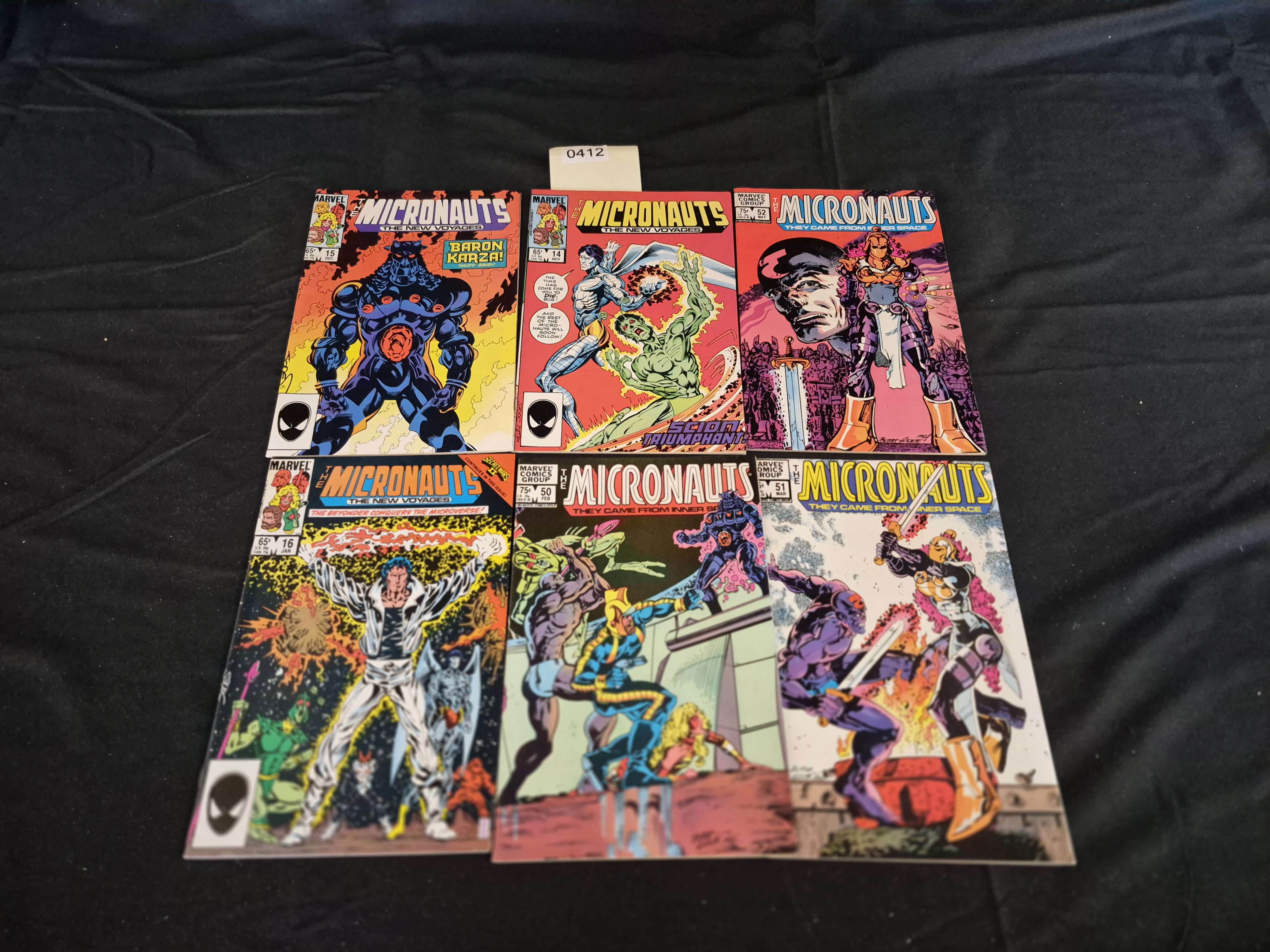 BID PER WHAT YOU SEE IN THE PHOTO, NOT THE AI GENERATED TITLES AND DESCRIPTIONS! A collection of six Copper Age Marvel Comics periodicals from the Micronauts franchise, published in the mid-1980s. The group consists of issues from two distinct series. The first series, Micronauts: They Came From Inner Space, includes three issues: #50 (75¢, Feb), #51 (75¢, Mar), and #52 (75¢, May). The second series, Micronauts: The New Voyages, includes three issues: #14 (65¢, Nov), #15 (65¢, Dec), and #16 (65¢, Jan). Issue #16 features a “Secret Wars” crossover banner across the top left corner. All issues display the classic Marvel Comics Group logo and the black Spider-Man corner box, characteristic of this publishing era. Key characters such as Baron Karza and Scion are featured prominently on the colorful, action-oriented covers. The comics are raw, unslabbed copies.
