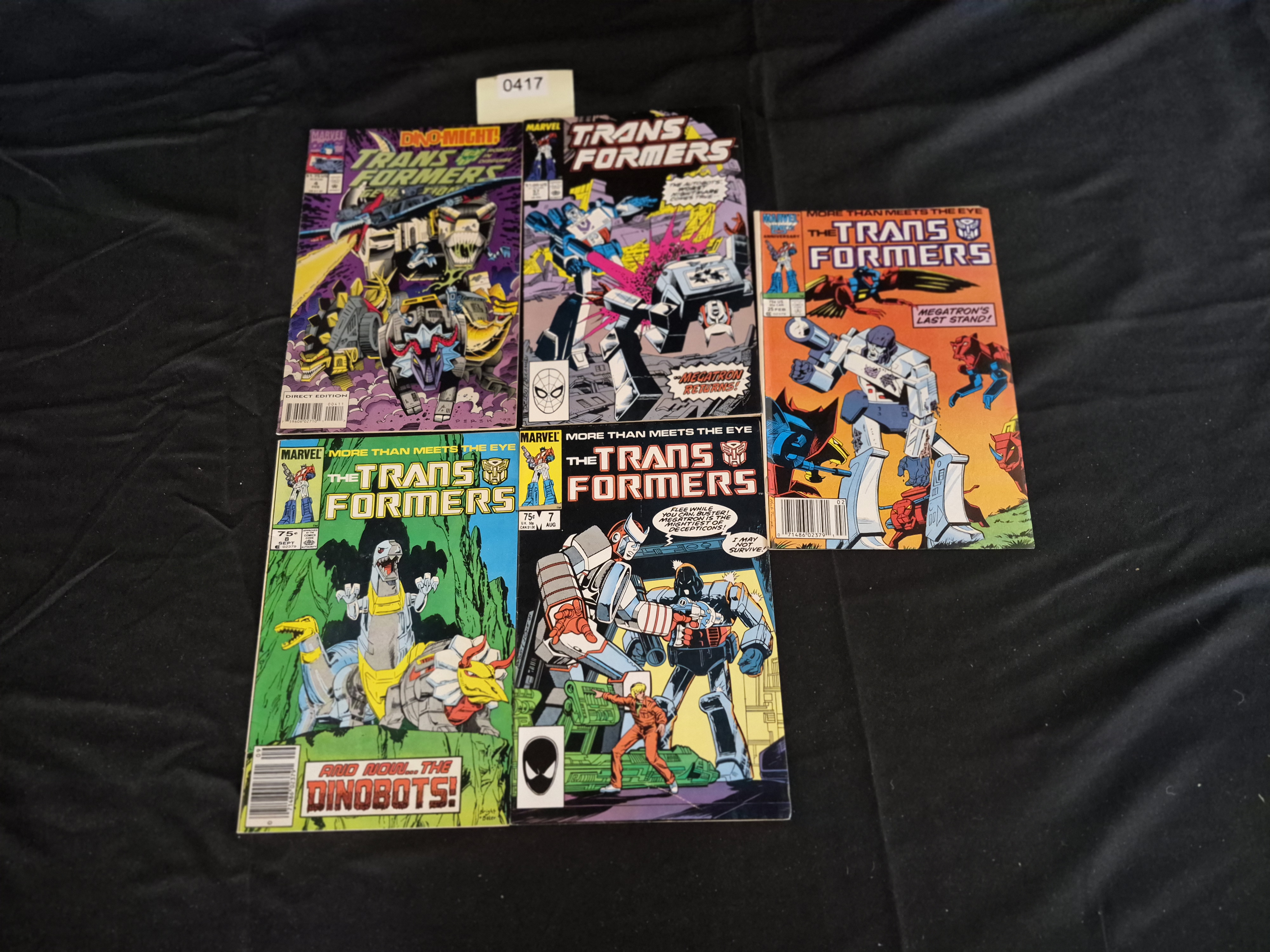BID PER WHAT YOU SEE IN THE PHOTO, NOT THE AI GENERATED TITLES AND DESCRIPTIONS! A collection of five vintage American comic books published by Marvel Comics from The Transformers series, identified by the “MORE THAN MEETS THE EYE” subtitle and the Autobot emblem. These issues are part of the 1984 series run, placing them within the Copper Age of comics. The books are printed on paper and feature vibrant original color artwork and standard comic book dimensions. Visible cover themes include appearances by Dinobots and confrontations featuring major characters such as Megatron. Several copies display a standard cover price of 75¢. The lot is identified by a small white paper tag marked “0417” visible near the top center.