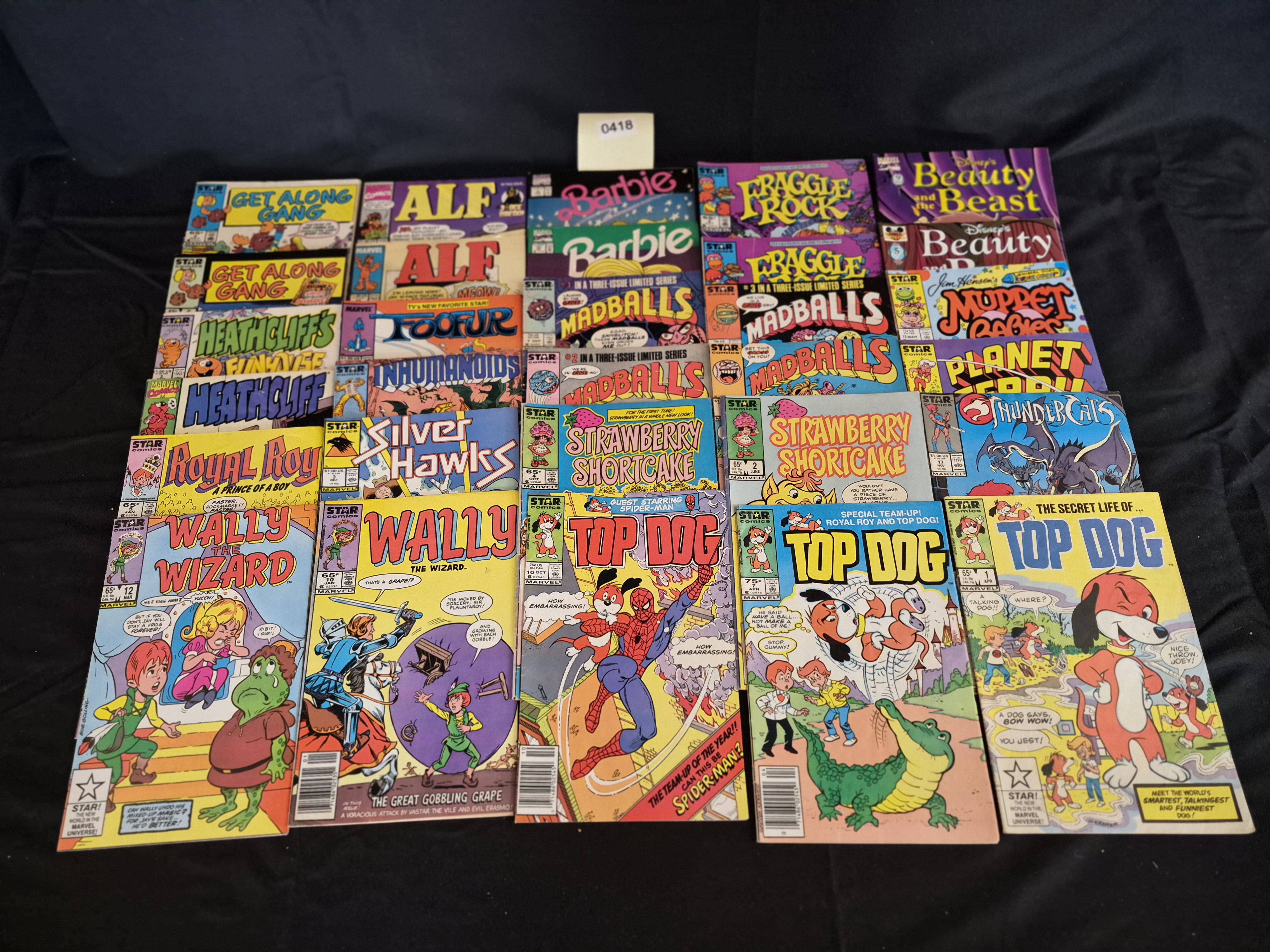 BID PER WHAT YOU SEE IN THE PHOTO, NOT THE AI GENERATED TITLES AND DESCRIPTIONS! A collection of 30 vintage American comic books published primarily under the Marvel Comics “Star Comics” imprint, dating predominantly from the mid-1980s. The lot consists of licensed titles featuring popular media characters of the era. The collection includes multiple issues of titles such as ALF, Barbie, Fraggle Rock, Heathcliff, Madballs, Wally the Wizard, and Top Dog. Other titles present include Get Along Gang, Royal Roy, Inhumanoids, Strawberry Shortcake, Muppet Babies, Silver Hawks, Thundercats, and Disney’s Beauty and the Beast. The comic books feature color-printed paper covers secured by visible staples. Most issues are low-numbered, bearing original cover prices typically ranging from 65¢, 75¢, or $1.00 US.