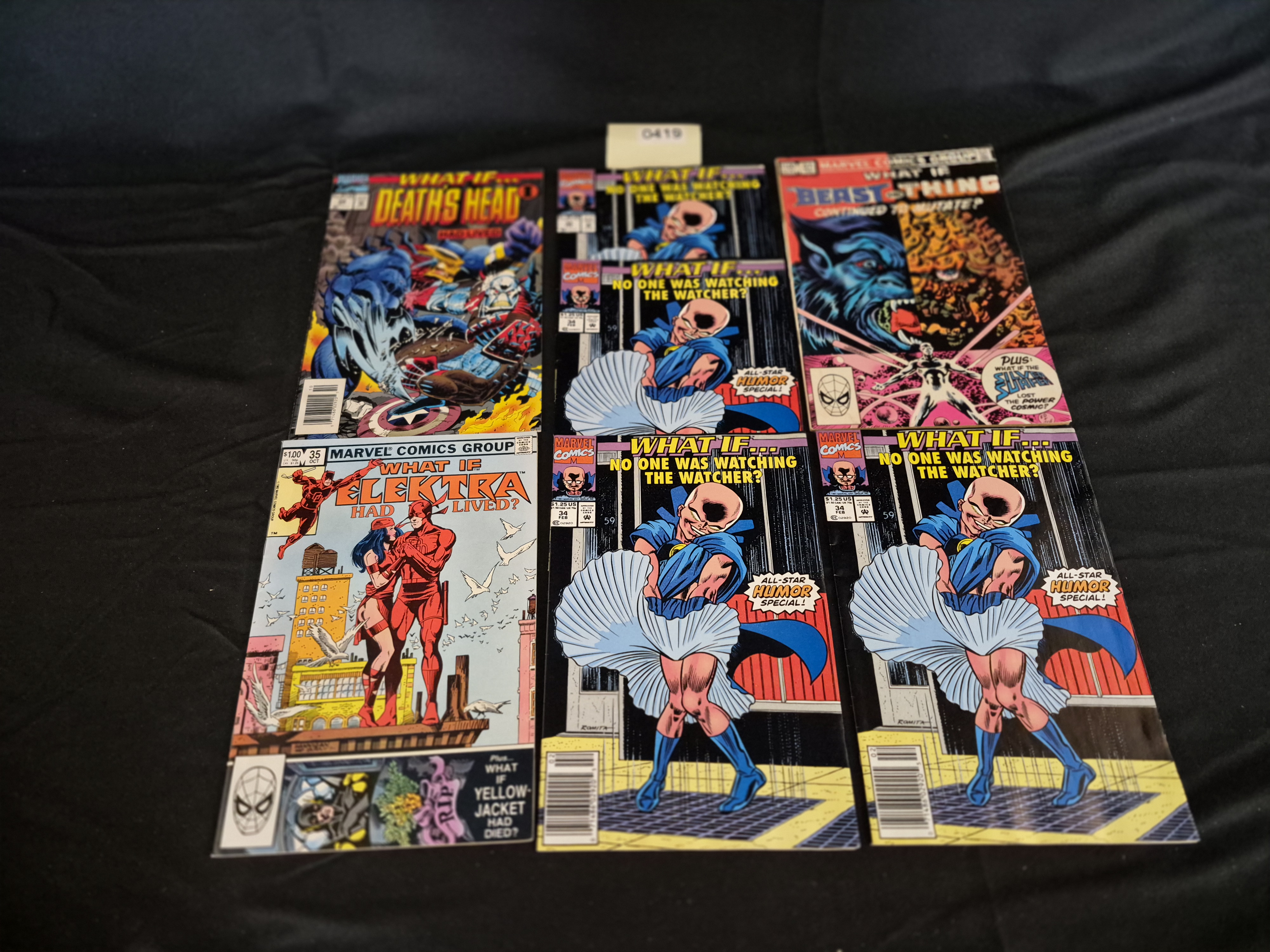 BID PER WHAT YOU SEE IN THE PHOTO, NOT THE AI GENERATED TITLES AND DESCRIPTIONS! A collection of six individual comic books published by Marvel Comics Group from the What If…? series, dating to the later Copper/early Modern Age of comics. The collection is arranged in two rows of three issues each. Specific visible issues include What If Death’s Head Had Lived?, What If Beast Continued to Mutate?, and What If Elektra Had Lived? (Issue 35, cover price $1.00), which also features a backup story titled What If Yellow Jacket Had Died?. The lot also contains three duplicate copies of the All-Star Humor Special! asking What If… No One Was Watching The Watcher? (Issue 34, cover price $1.25), which depicts the Watcher in a ballet tutu. The comics are constructed of paper and cardstock. A small white inventory label marked 0419 is present above the center comics.
