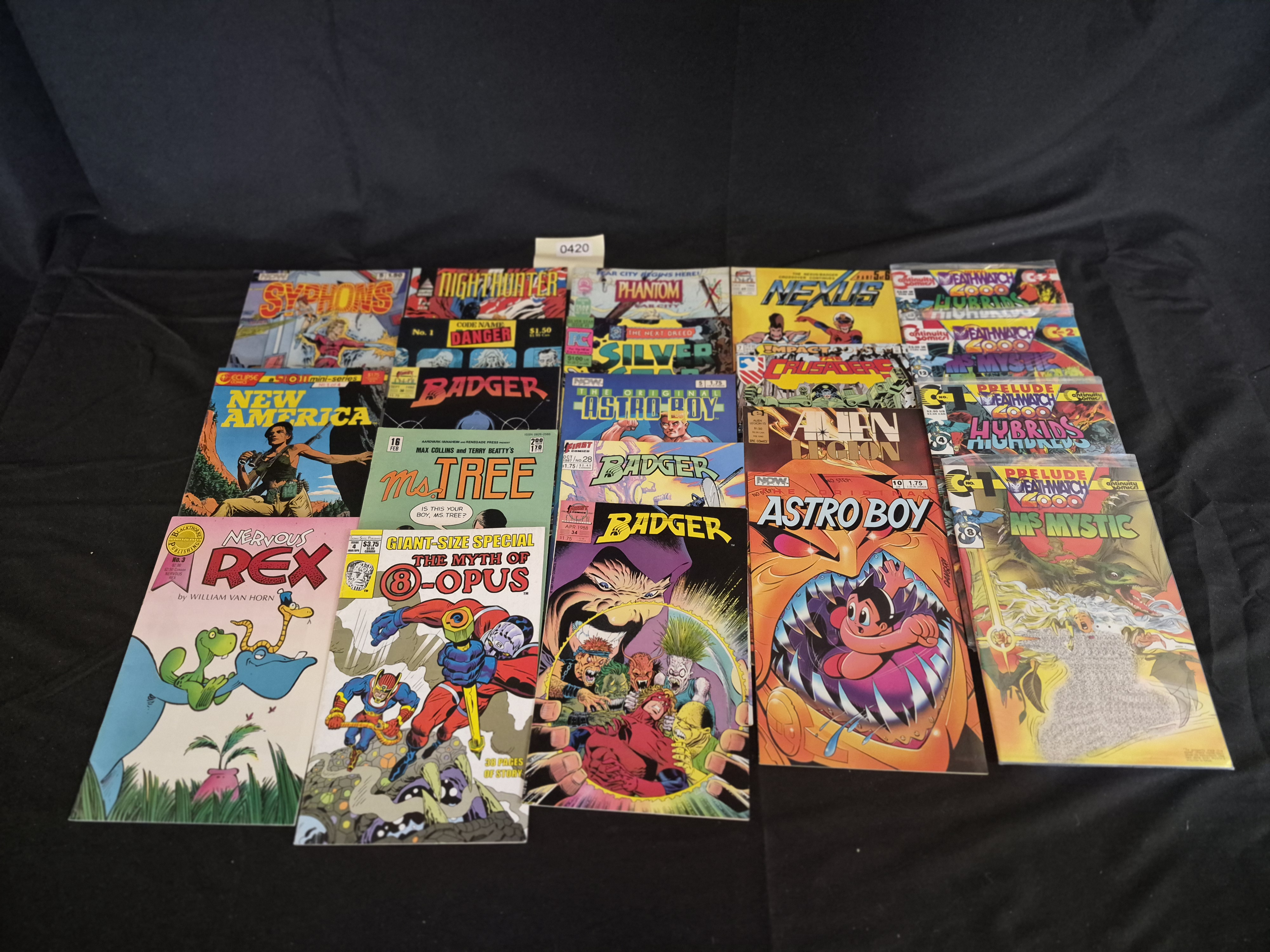 BID PER WHAT YOU SEE IN THE PHOTO, NOT THE AI GENERATED TITLES AND DESCRIPTIONS! A collection of eighteen independent comic books and graphic novels dating primarily from the Copper and Modern Ages, circa 1980s to 1990s. The lot features titles from various independent publishers, including Aardvark-Vanaheim/Renegade, Epic Comics, Eclipse Comics, NOW Comics, Blackthorne Publishing, and Continuity Comics. Key titles visible include multiple issues of Badger, Ms. Tree, Astro Boy, Nexus, Alien Legion, New America, Nervous Rex, and titles associated with Continuity Comics such as Ms. Mystic and Hybrids. The books are constructed of paper and cardstock and feature colorful cover art. Many of the books appear to be housed in clear plastic protective sleeves. A small white paper slip marked 0420 is visible within the arrangement.