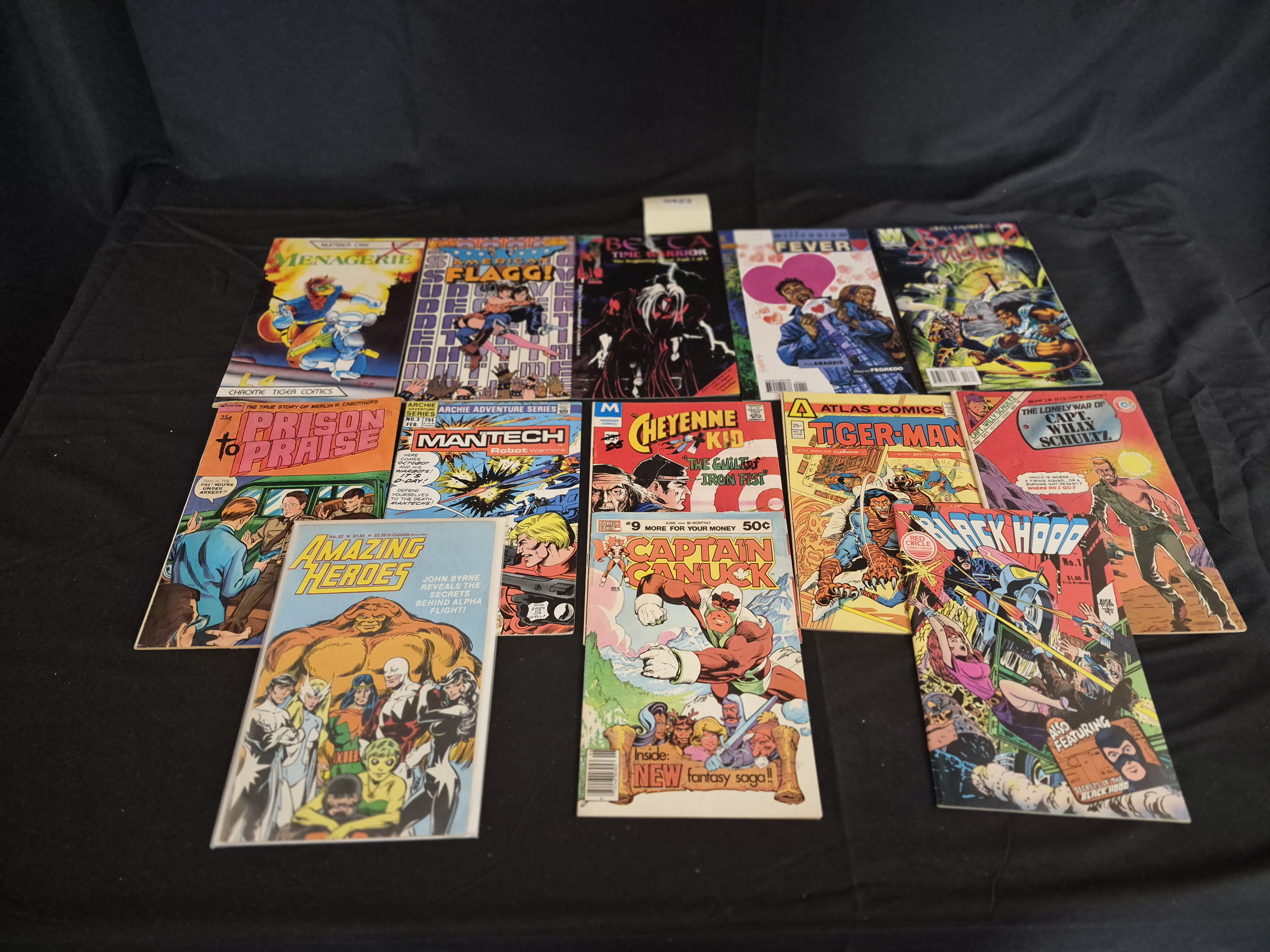 BID PER WHAT YOU SEE IN THE PHOTO, NOT THE AI GENERATED TITLES AND DESCRIPTIONS! A collection of thirteen independent and specialty comic books and periodicals, primarily dating from the Bronze Age through the early Modern Age (approximately 1970s to 1980s). The items are printed on paper or cardstock with full-color covers. The collection includes titles from various independent and specialty publishers, including those identified in market research such as Captain Canuck (Comely Comix), American Flagg!, Tiger-Man (Atlas Comics), Mantech (Archie Adventure Series), Black Hood No. 1, and Amazing Heroes No. 22. Other visible titles include Cheyenne Kid, Millennium Fever, and Prison to Praise. The collection represents a variety of genres, including superhero, sci-fi, and independent adventure. Visible cover price points range from 25 cents to $1.95.