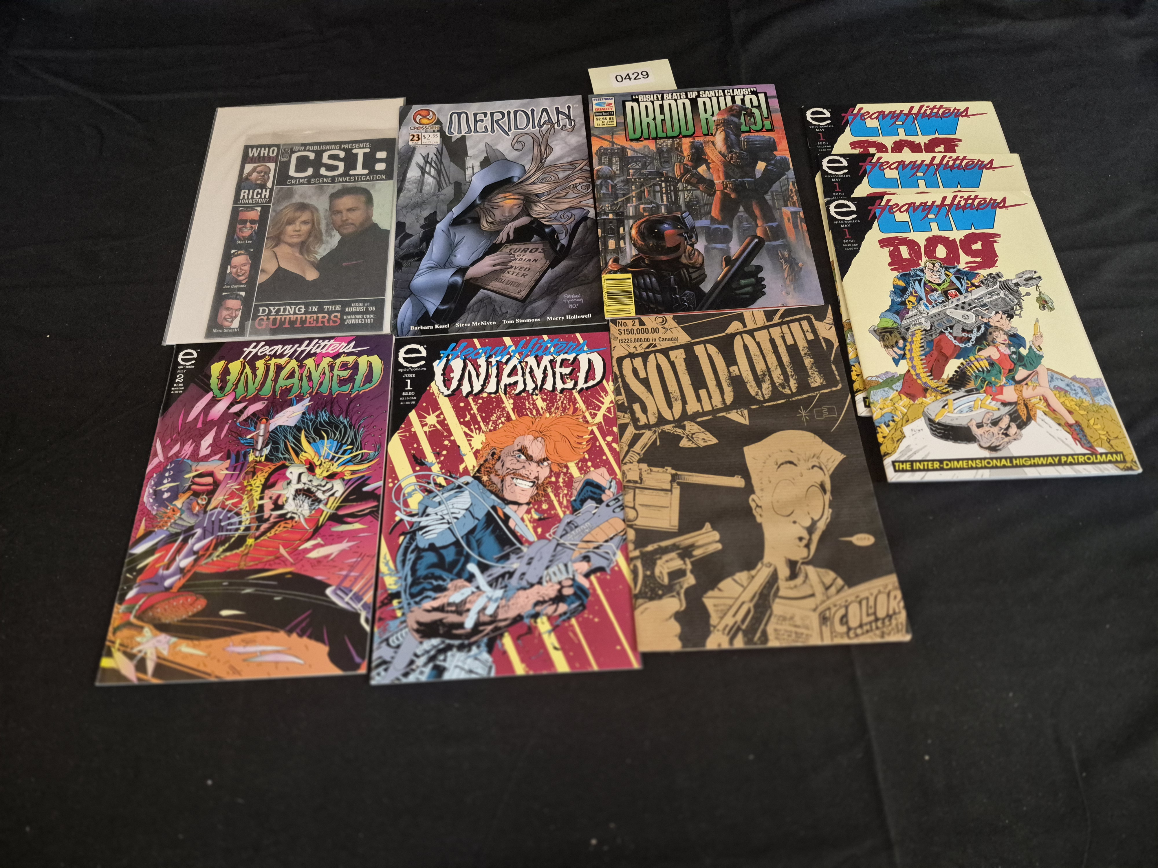 BID PER WHAT YOU SEE IN THE PHOTO, NOT THE AI GENERATED TITLES AND DESCRIPTIONS! A collection of nine American comic books and periodicals, primarily dating from the late 20th and early 21st centuries. The lot includes titles from various publishers such as Epic Comics (Marvel), IDW, CrossGen, and Fleetway/Quality. Specific titles include three copies of Heavy Hitters Claw Dog, two copies of Heavy Hitters Untamed (Issue #1 and Issue #2), one copy of CSI: Crime Scene Investigation (IDW), one copy of Meridian #23 (CrossGen), one copy of Dredd Rules! (Fleetway/Quality), and one copy of Sold-Out #2. The artwork is characteristic of the stylized aesthetic common in 1990s and early 2000s publications. One issue of Dredd Rules! features a yellow inventory sticker marked 0429 on the cover. Constructed of printed paper in a softcover format.
