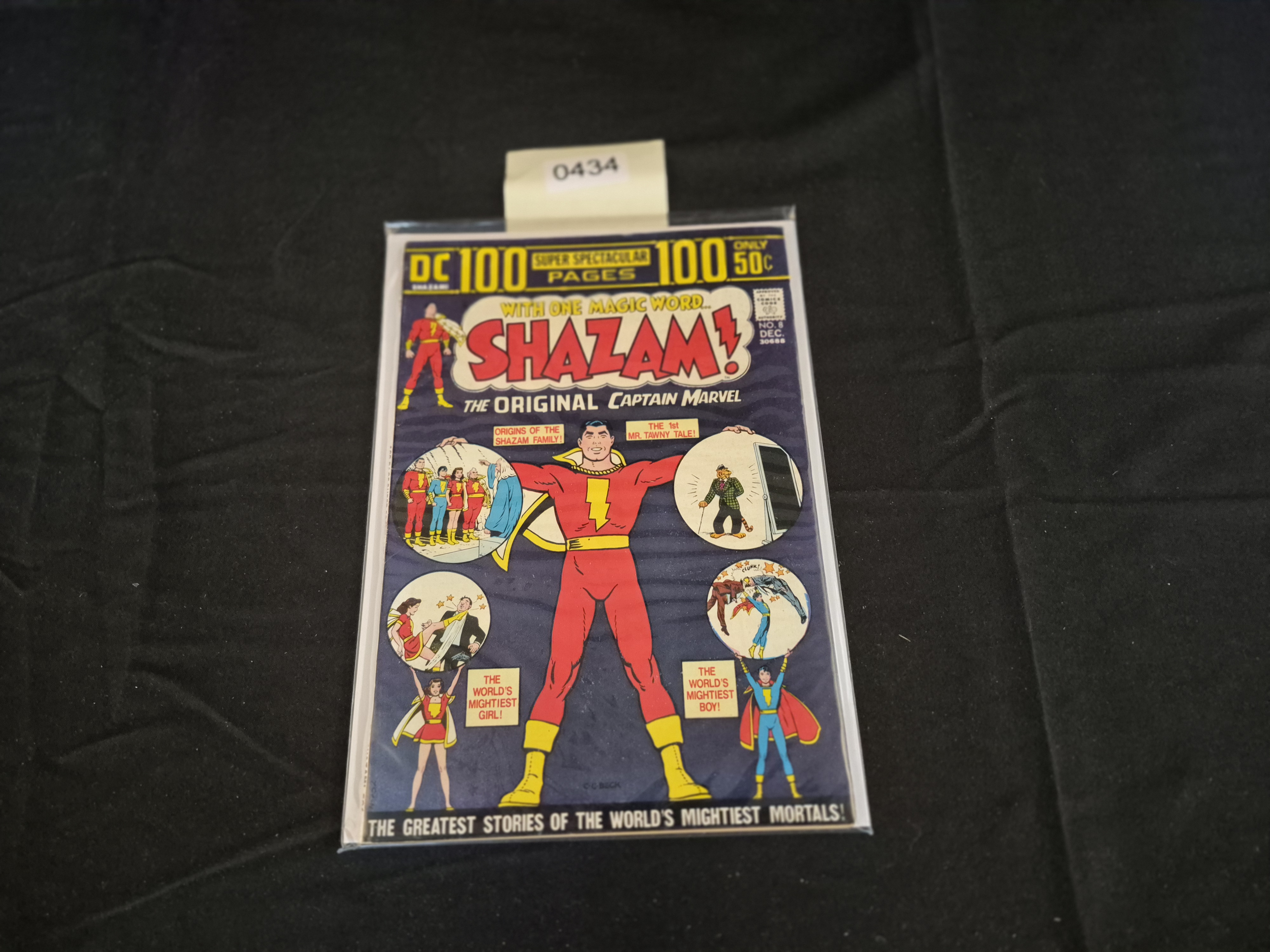 BID PER WHAT YOU SEE IN THE PHOTO, NOT THE AI GENERATED TITLES AND DESCRIPTIONS! A single American comic book published by DC Comics, Shazam! The Original Captain Marvel, Issue No. 8, dated December 1973, with a cover price of 50¢. This issue is part of the 100 Page Super Spectacular line. Web intelligence confirms that Shazam #8 contains the first Bronze Age reprint appearance of the villain Black Adam, originally published in The Marvel Family #1. The cover features Captain Marvel prominently, surrounded by vignettes illustrating “Origins of the Shazam Family,” “The 1st Mr. Tawny Tale,” “The World’s Mightiest Girl!,” and “The World’s Mightiest Boy!.” The item is currently presented in a clear plastic sleeve with a backing board. An adhesive inventory label marked “0434” is positioned above the sleeve.