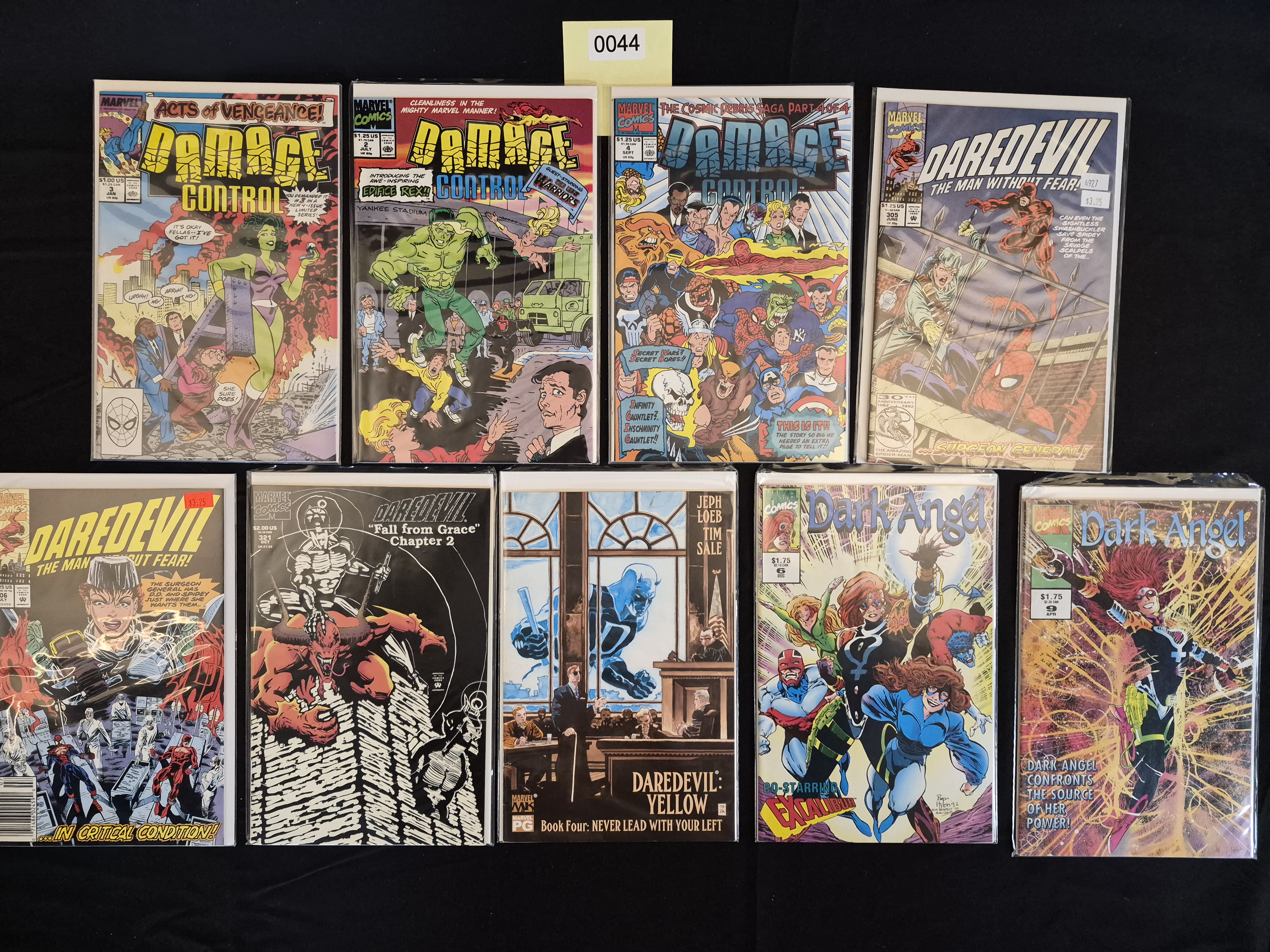BID PER WHAT YOU SEE IN THE PHOTO, NOT THE AI GENERATED TITLES AND DESCRIPTIONS! A collection of nine modern Marvel Comics, published primarily between the late 1980s and early 1990s. The lot includes titles from three distinct series: Damage Control, Daredevil, and Dark Angel. The comics are individually sleeved and boarded. Specific issues include: Damage Control (Issues #3, #2, #4, featuring storylines such as “Acts of Vengeance” and “The Cosmic Debris Saga”); Daredevil (Issues #305, #306, #321 “Fall from Grace: Chapter 2,” and the Marvel MAX imprint title Daredevil: Yellow Book Four); and Dark Angel (Issues #6 and #12). Visible cover prices range from $1.00 USD to $2.25 USD, with some issues displaying Canadian pricing. A yellow numerical tag marked “0044” is visible above the top row.