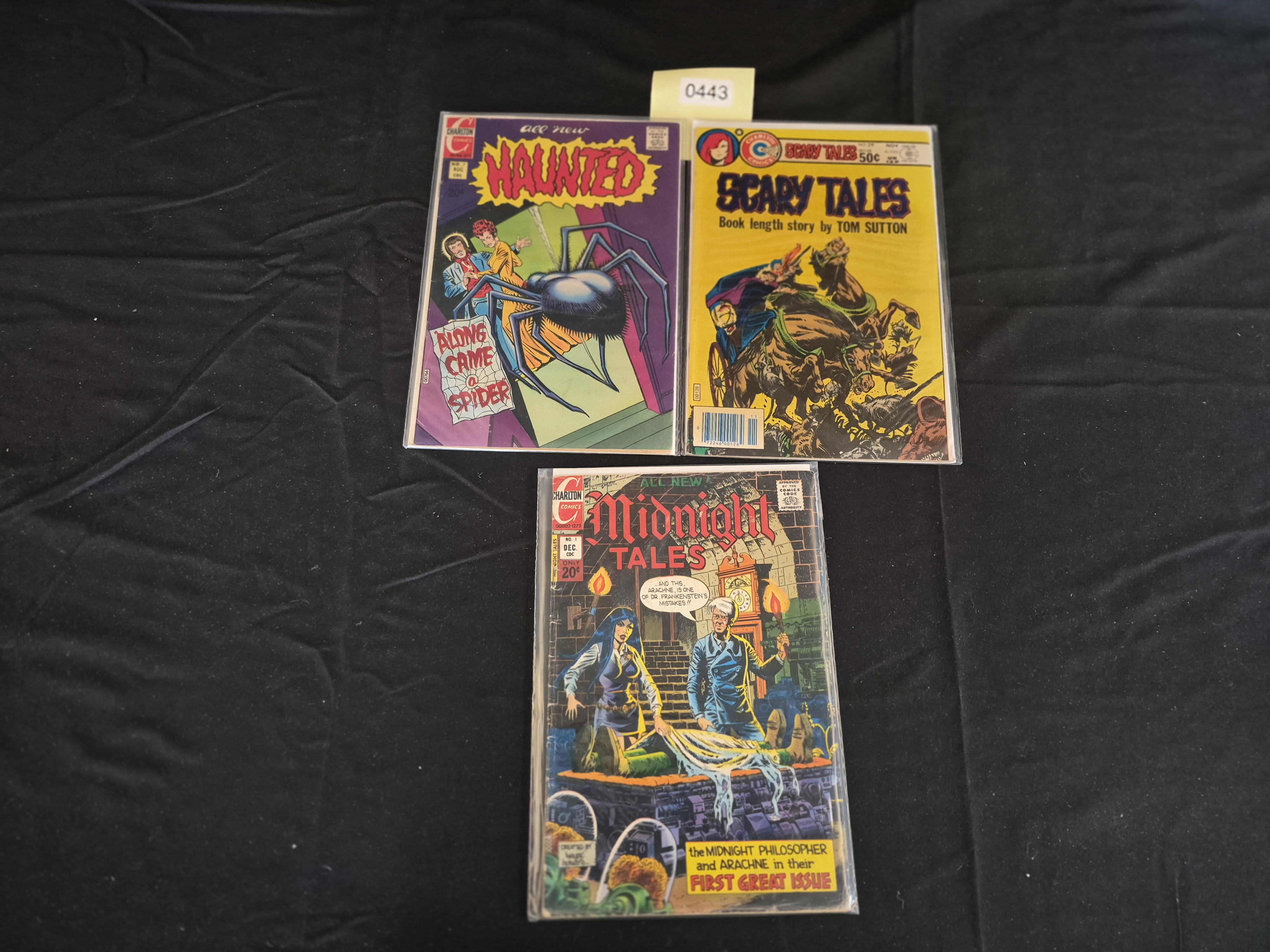 BID PER WHAT YOU SEE IN THE PHOTO, NOT THE AI GENERATED TITLES AND DESCRIPTIONS! A collection of three Bronze Age horror and mystery comic books published by Charlton Comics. The lot includes three distinct titles, all secured within protective plastic sleeves. The first title is Haunted No. 7 (August, 20¢), identified by web research as being published in 1972, featuring a cover depicting a man, woman, and large spider, with cover art attributed to Ditko in market listings. The second title is Scary Tales No. 27 (November, 50¢), featuring a yellow cover with a horse-drawn carriage scene and identifying a book-length story by Tom Sutton. The third title is Midnight Tales No. 1 (December, 20¢), prominently marked as the “FIRST GREAT ISSUE” and displaying the Comics Code Authority stamp.