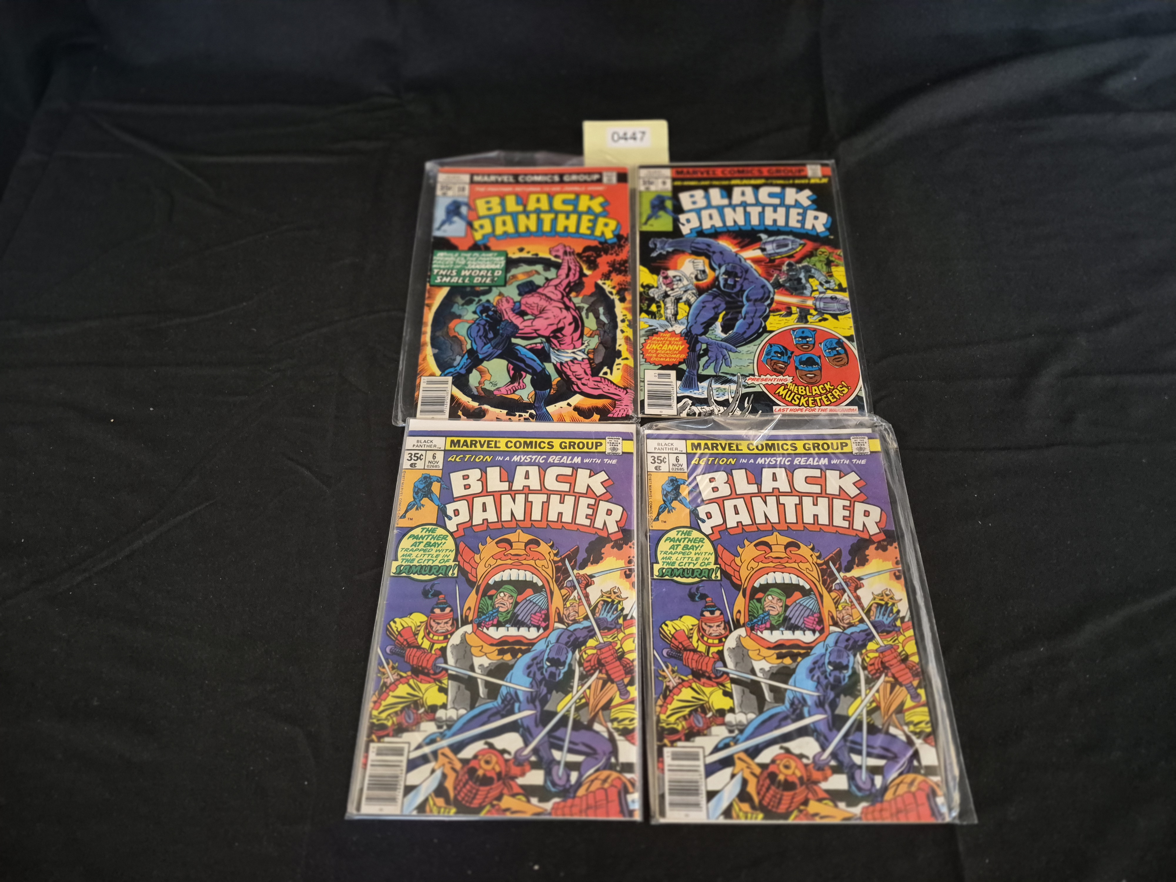 BID PER WHAT YOU SEE IN THE PHOTO, NOT THE AI GENERATED TITLES AND DESCRIPTIONS! A collection of four late Bronze Age Marvel Comics Group Black Panther paper comic books, identified as part of the 1977 series. The lot includes three distinct issues, with one issue duplicated. The specific titles included are Issue #3 (30¢ cover price, dated August), Issue #5 (30¢ cover price, dated October), and two identical copies of Issue #6 (35¢ cover price, dated November 1977). Issue #6 features the cover title “The Panther at Bay! Trapped with Mr. Little in the City of Samurai!” The comics feature color-printed illustrations characteristic of 1970s superhero artwork, consistent with the period of the series. All items are individually stored within clear plastic sleeves. An inventory tag bearing the number 0447 is visible behind the top row.