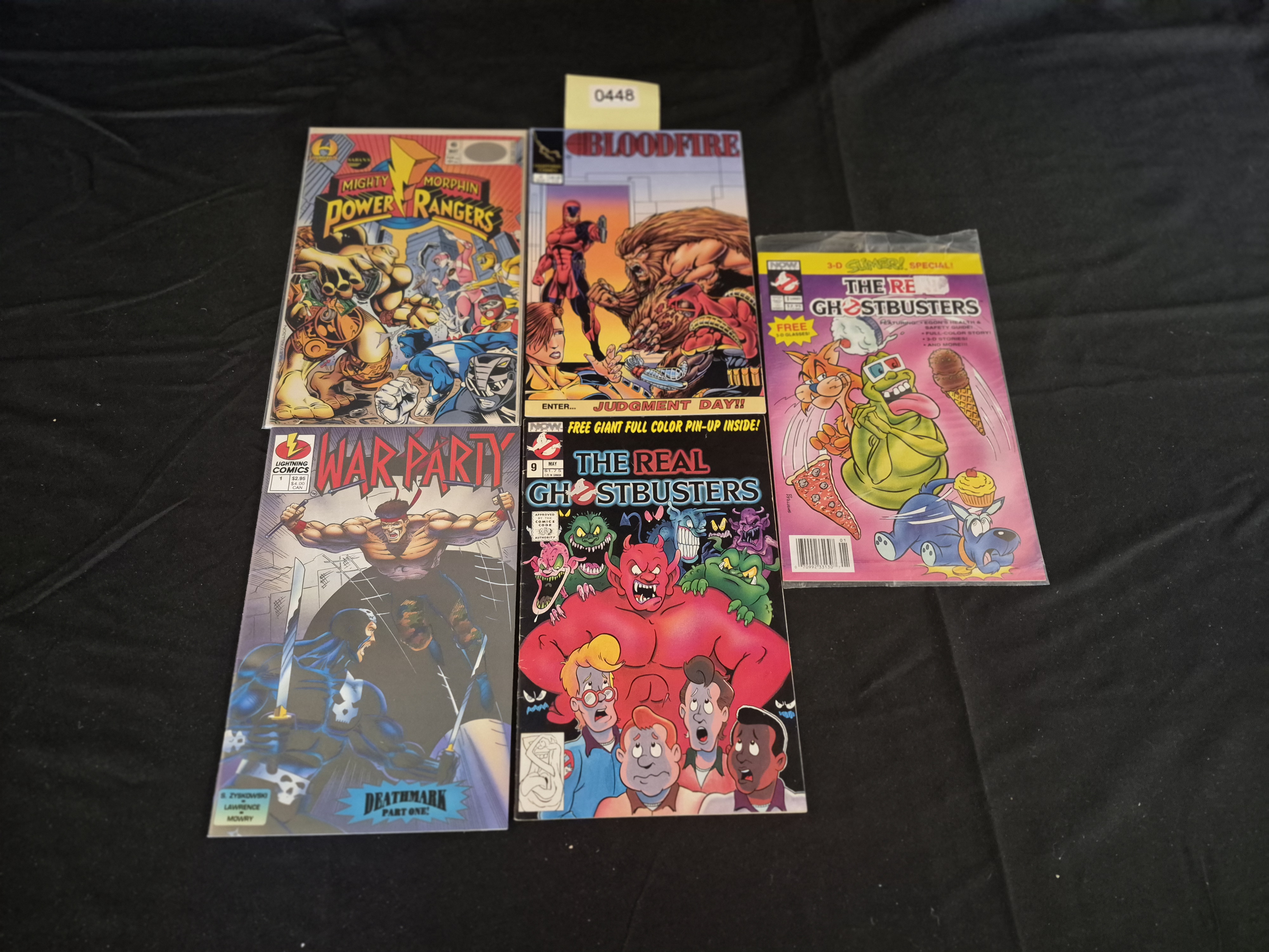 BID PER WHAT YOU SEE IN THE PHOTO, NOT THE AI GENERATED TITLES AND DESCRIPTIONS! A collection of five comic books produced on printed paper stock with glossy, full-color illustrated covers. The collection includes various titles typical of the late 20th-century superhero and action genres. Titles present are Mighty Morphin Power Rangers, Bloodfire, War Party (Lightning Comics, Issue #1, subtitled DEATHMARK PART ONE!), and two issues of The Real Ghostbusters (NOW Comics). The Real Ghostbusters issues include Issue #9 and a 3-D Summer Special. The 3-D Summer Special is sealed in its original plastic bag and advertises FREE 3-D GLASSES!. Visible pricing information on the covers ranges from $1.75 to $2.95 USD.