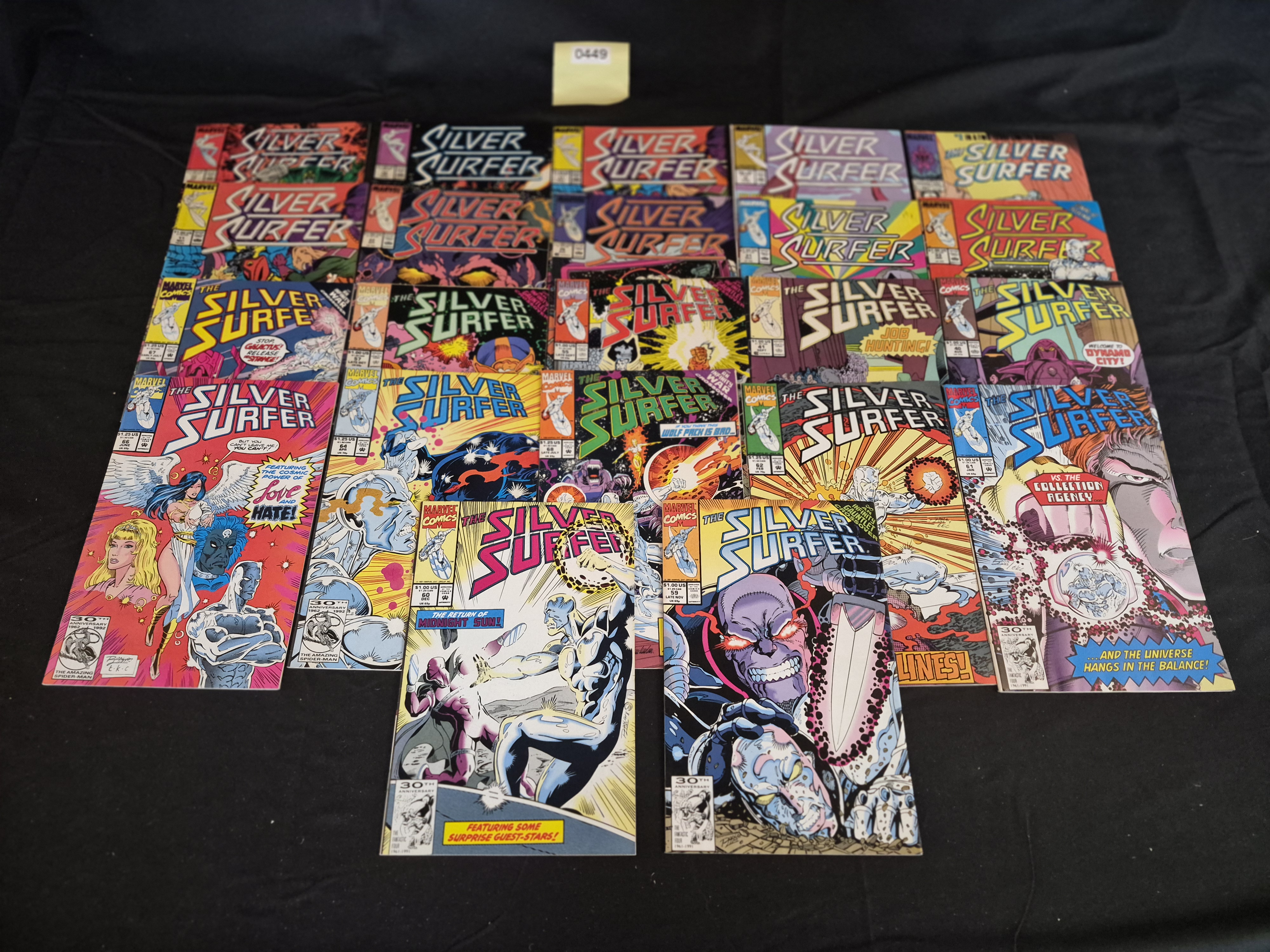 BID PER WHAT YOU SEE IN THE PHOTO, NOT THE AI GENERATED TITLES AND DESCRIPTIONS! A collection of 28 issues of the Marvel Comics title, The Silver Surfer, primarily from Volume 3 (1987 series). The books are characteristic of the Modern Age of comics, dating predominantly to the early 1990s, as evidenced by the $1.00 or $1.25 US cover prices and the visible “30th Anniversary” emblem (1961-1991) on several covers. The items are printed on paper stock with full-color artwork. The collection includes issues featuring major Marvel crossover storylines, including mentions of the “Infinity War” and “The Infinity Gauntlet Crossover,” indicating publication dates around 1992-1994. An administrative note labeled “0449” is visible in the arrangement.
