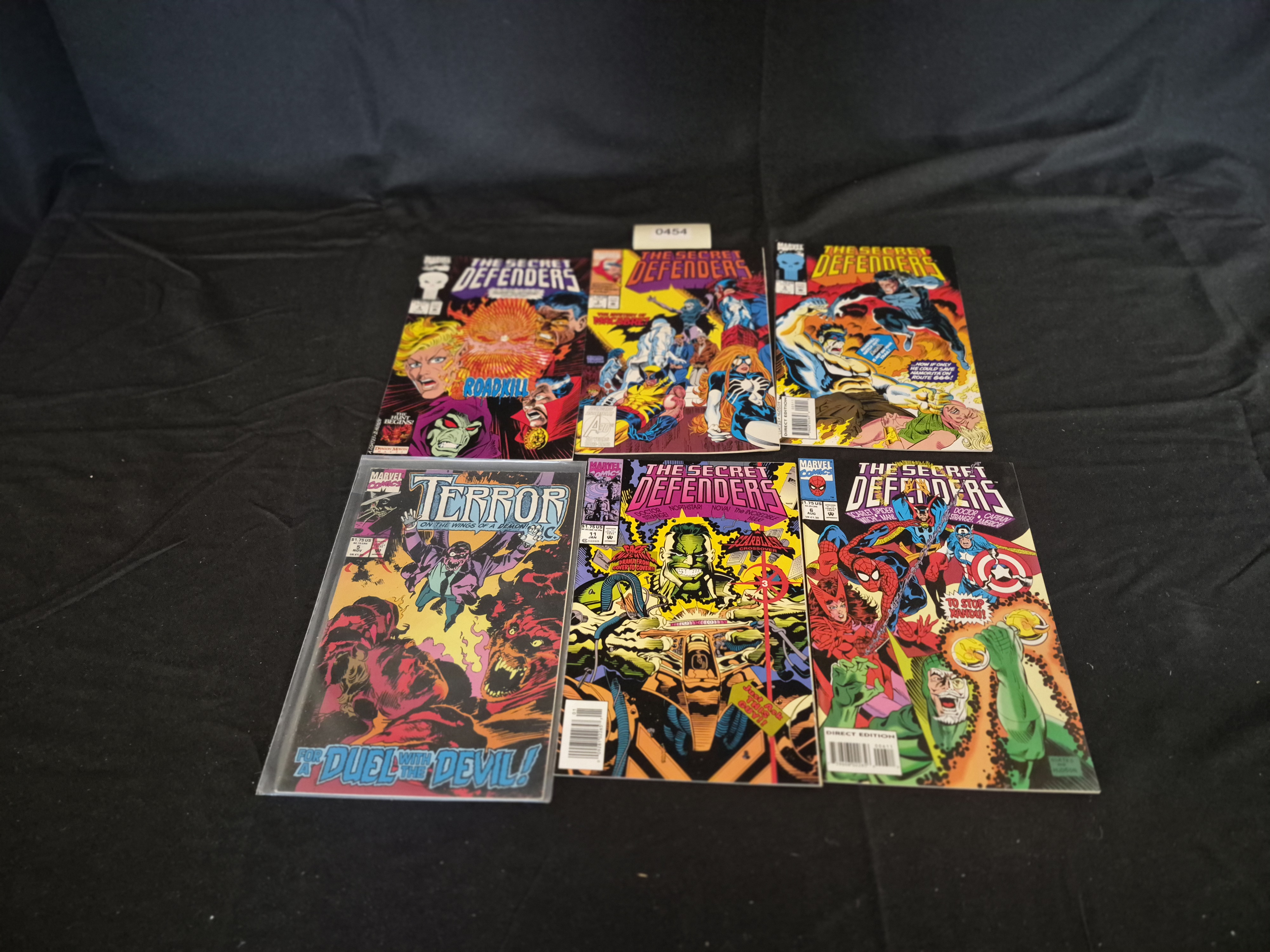 BID PER WHAT YOU SEE IN THE PHOTO, NOT THE AI GENERATED TITLES AND DESCRIPTIONS! A collection of six individual Marvel Comics periodical publications dating from the 1990s Modern Age of Comics. The lot includes five issues of the series The Secret Defenders and one issue of Terror Inc. The Secret Defenders issues visible are #15, #16, #17, #3, and #6. The single issue of Terror Inc. is #11, subtitled On the Wings of a Demon! Duel with the Devil! All comics feature full-color paper covers depicting various Marvel characters including Doctor Strange, The Punisher, Wolverine, Scarlet Spider, Captain America, and The Hulk. The covers display standard US pricing of $1.75. The Terror Inc. issue is protected within a clear plastic sleeve and backing board. An inventory sticker marked 0454 is present in the center of the arrangement.